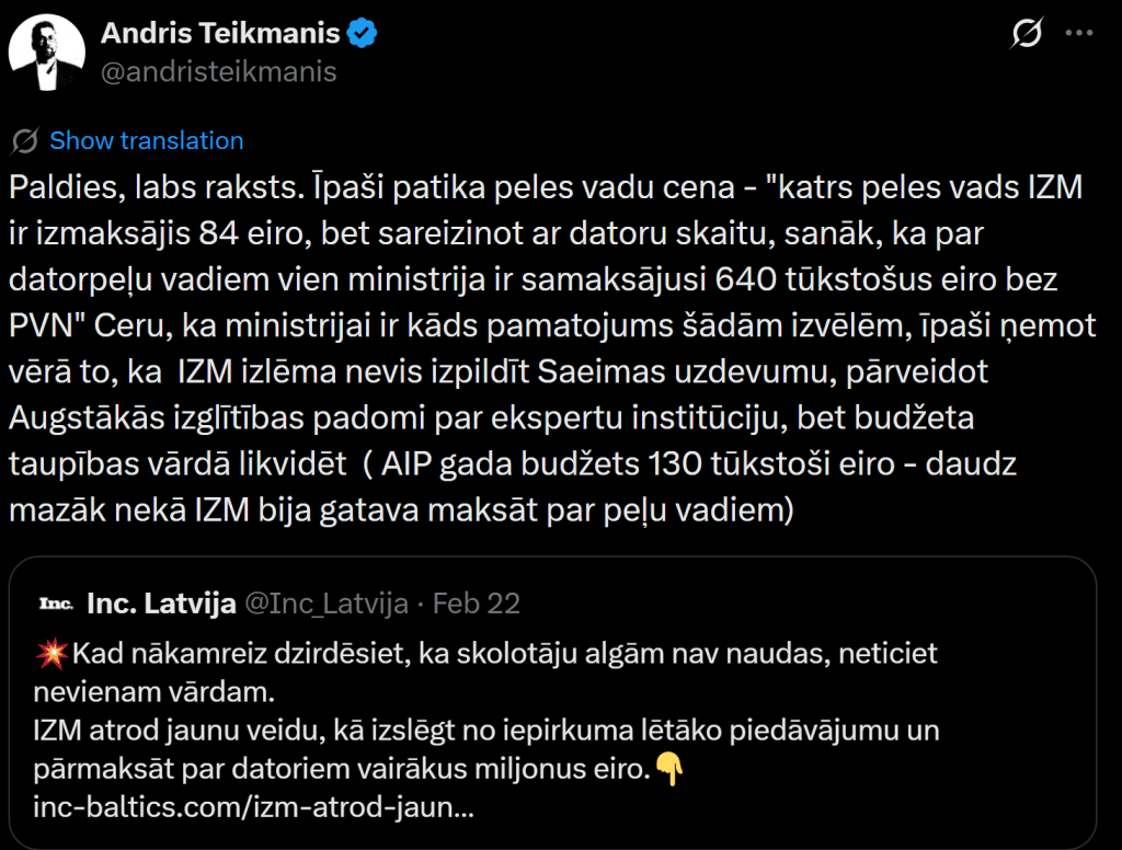 «У этого в Латвии давние традиции — десятки лет назад тогдашний финансовый директор Рижской думы (активный твиттерист), отвечая на вопрос, почему за компьютеры переплачивают в 3 раза, потому что покупают их у фирмы другого активного пользователя сооцсети X, сказал: “Мы не настолько богаты, чтобы покупать дешёвые вещи!”»
