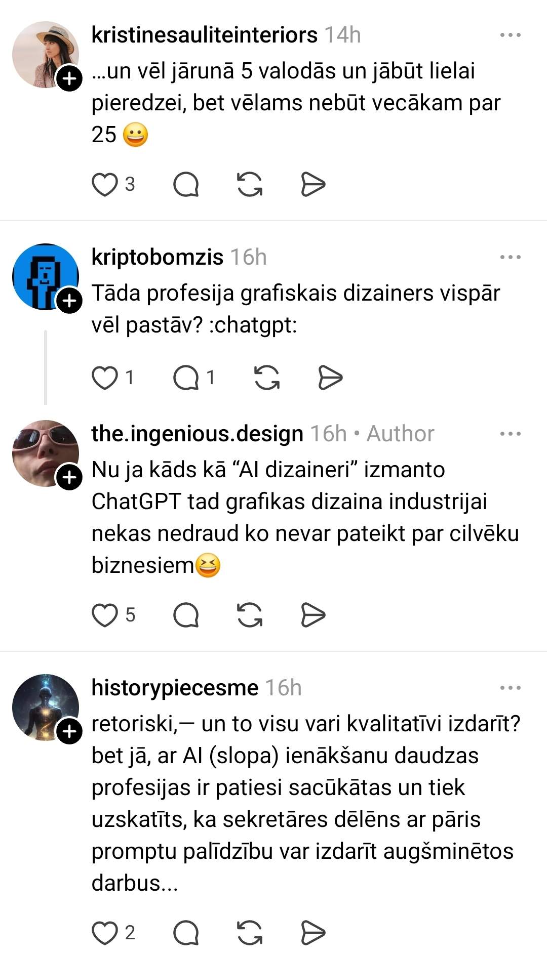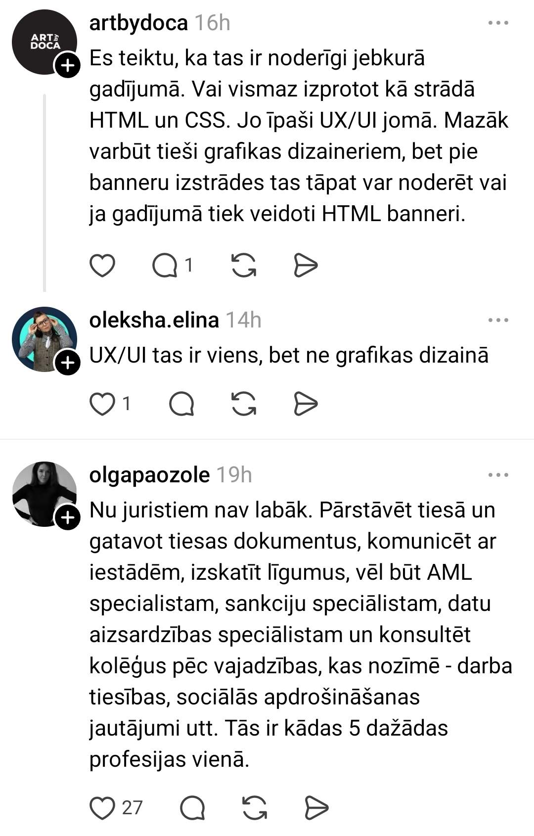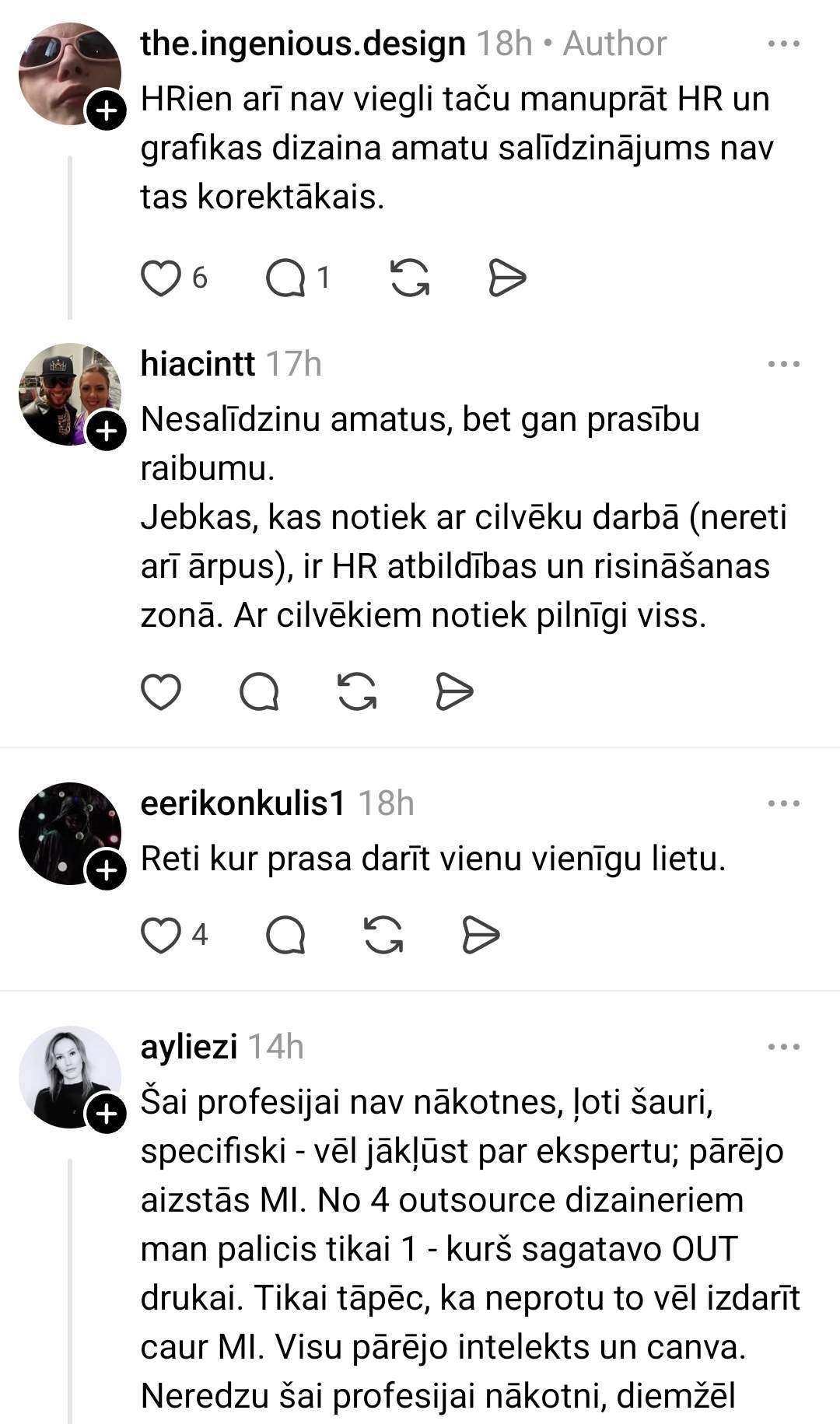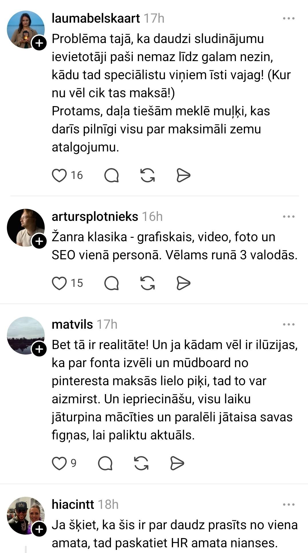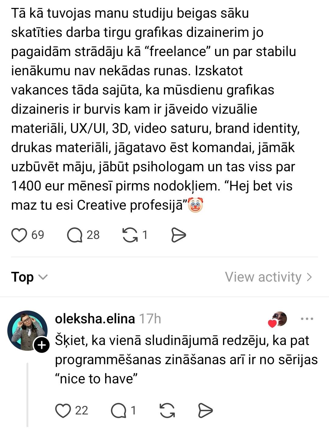 “Так как приближается окончание моей учёбы, я начал изучать рынок труда для графического дизайнера, потому что пока работаю как “freelance”, и о стабильном доходе не может быть и речи. Просматривая вакансии, такое ощущение, что современный графический дизайнер — это волшебник, который должен создавать визуальные материалы, UX/UI, 3D, видеоконтент, brand identity, печатные материалы, готовить еду для команды, уметь построить дом, быть психологом и всё это за 1400 евро в месяц до вычета налогов, но хей, зато ты как минимум в Creative профессии,” — иронизирует молодой человек.