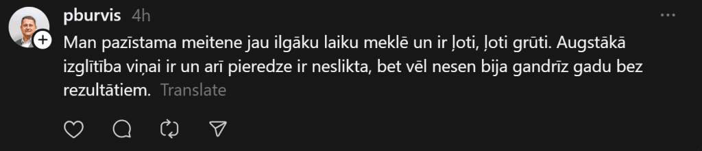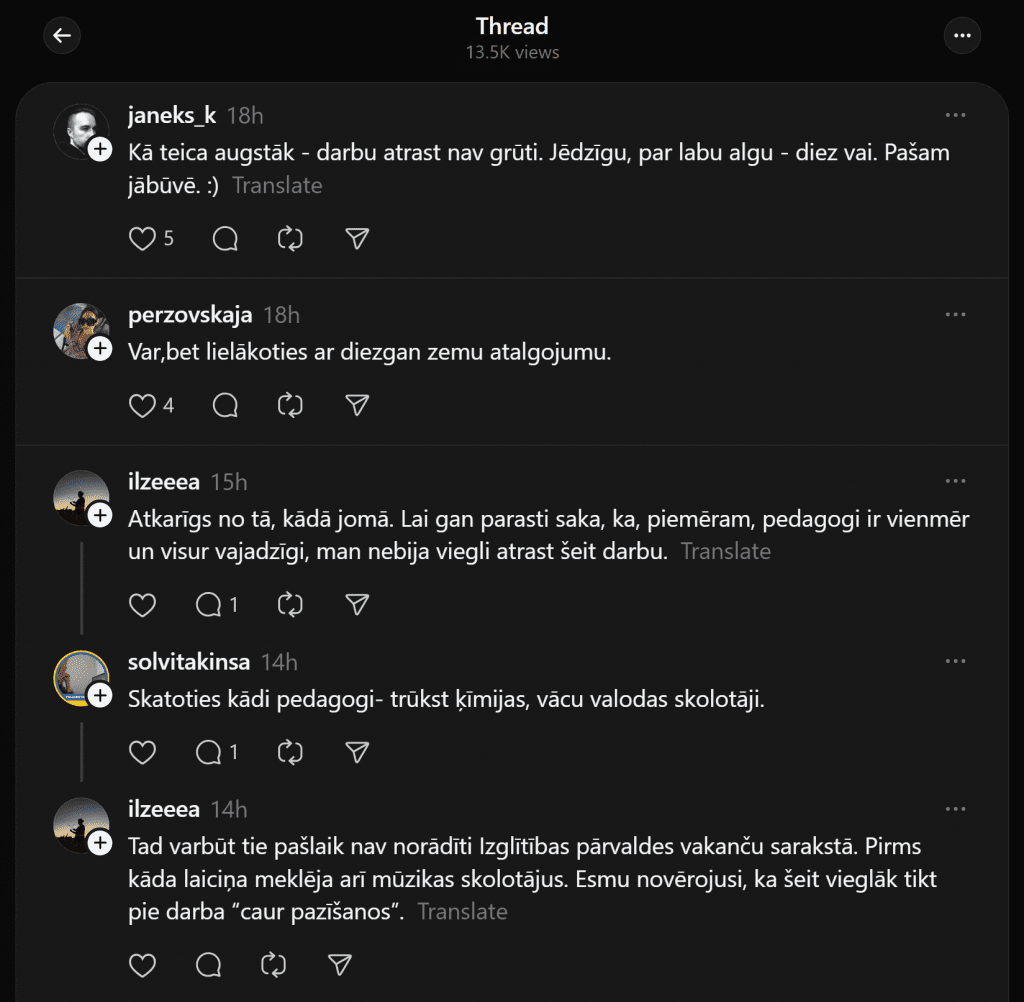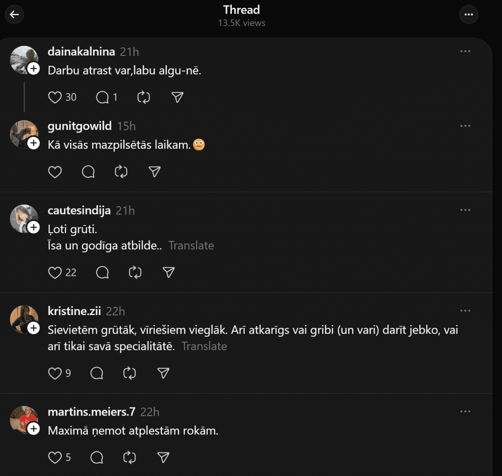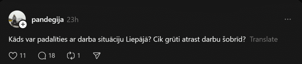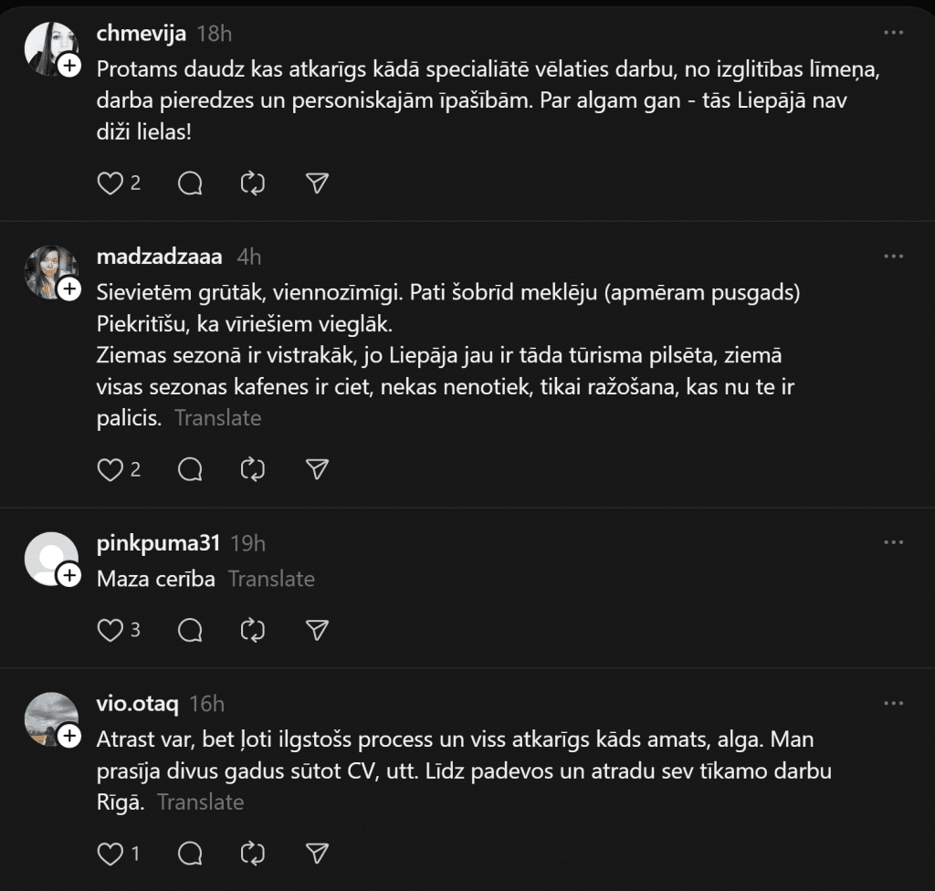 Кажется, наиболее остро такая проблема может ощущаться в регионах, потому что там нередко просто мало рабочих мест. И в Лиепае, хотя это третий по величине город Латвии, как выясняется, найти «нормальную» работу не так-то просто. Эту проблему в сети “Threads” поднимает одна пользовательница соцсетей. «Может кто-то поделиться ситуацией с работой в Лиепае? Насколько трудно сейчас найти работу?» — спрашивает Эндия.