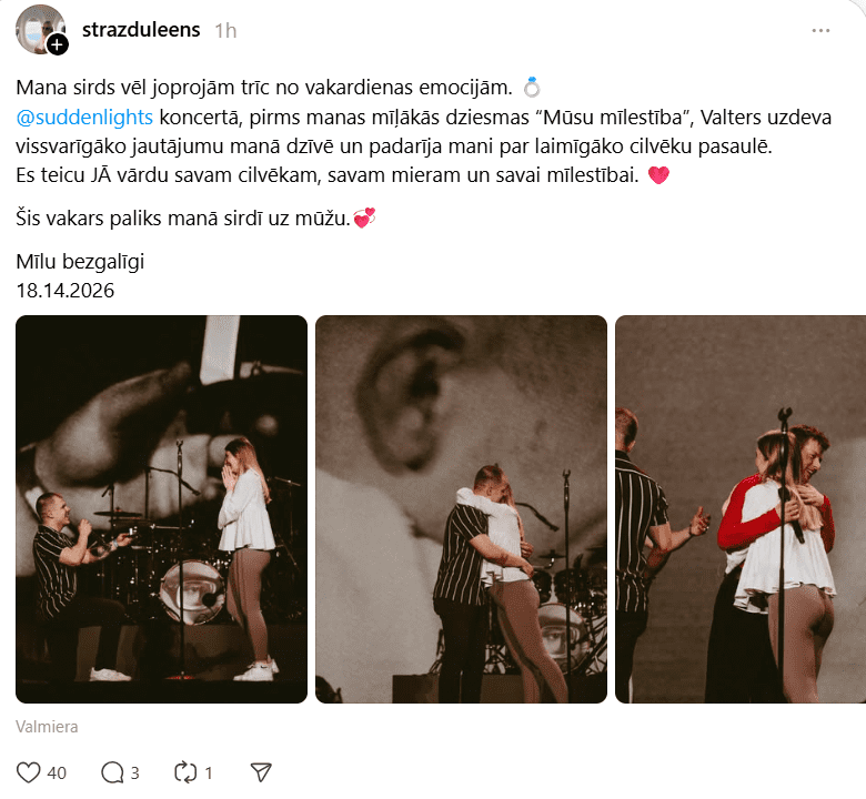 Как сообщалось, вчера, 18 апреля, в Валмиерском олимпийском центре царила незабываемая атмосфера. Во время концерта группы “Sudden Lights” присутствующие стали свидетелями очень личного и трогательного момента — предложения руки и сердца. Сегодня своими эмоциями в социальной сети “Threads” поделилась и сама невеста.