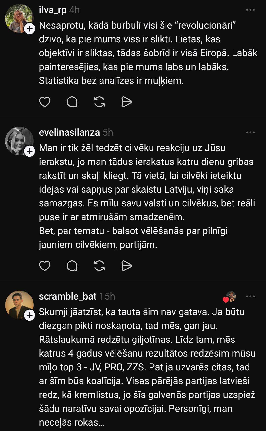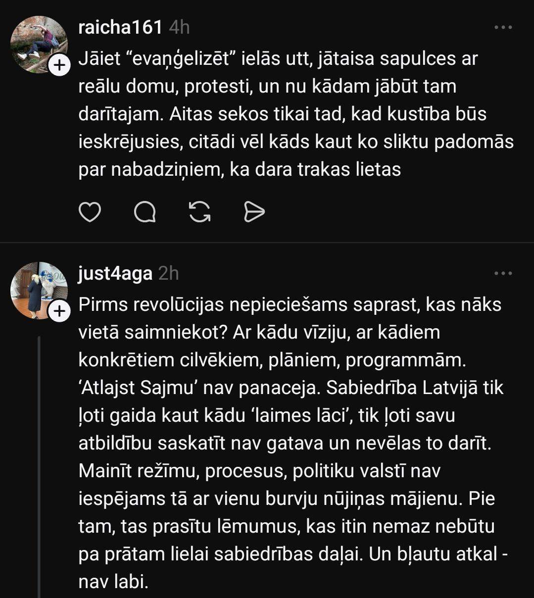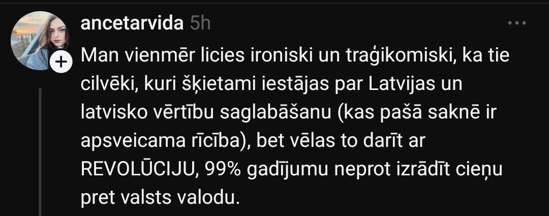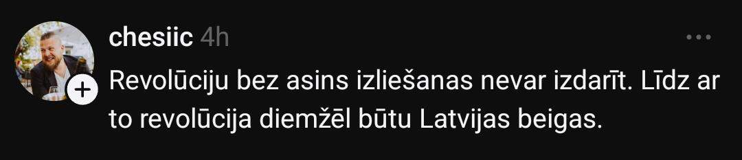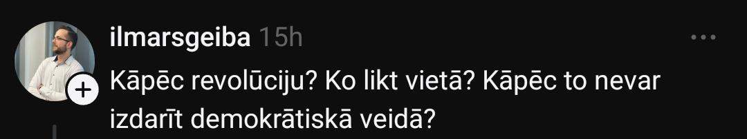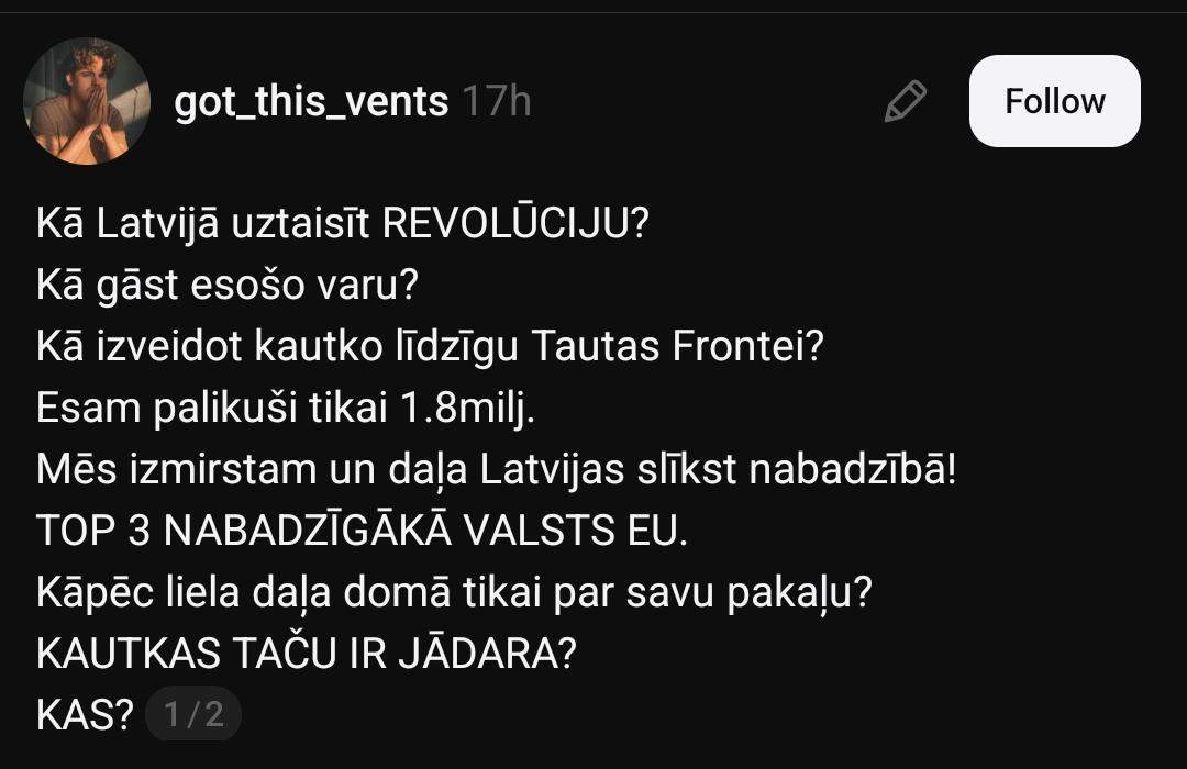 На платформе социальных сетей “Threads” Гатис начал серьёзную дискуссию, задав несколько вопросов: “Как в Латвии устроить революцию? Как свергнуть нынешнюю власть? Как создать что-то вроде Народного фронта?