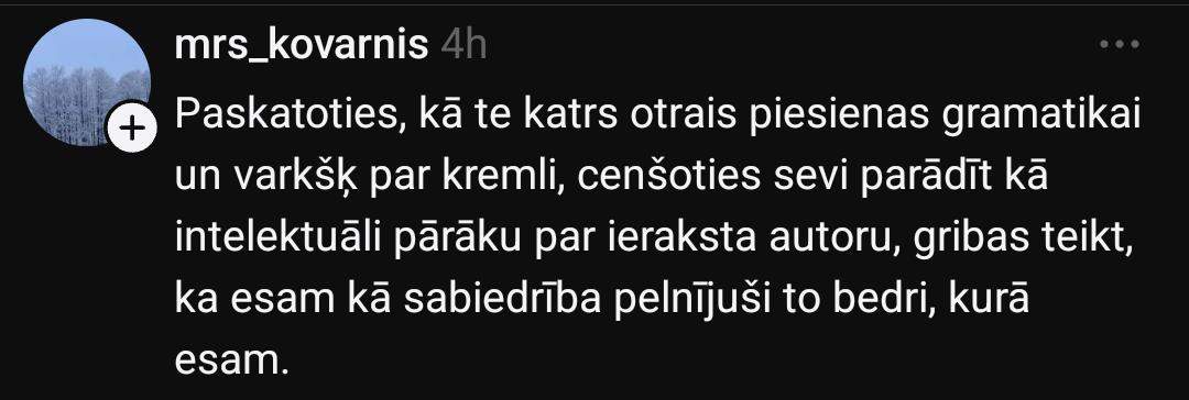 В свою очередь пользователь с ником @mrs_kovarnis высказывается особенно жёстко: “Глядя на то, как тут каждый второй цепляется к грамматике и ноет про Кремль, пытаясь показать себя интеллектуально выше автора записи, хочется сказать, что мы как общество заслужили ту яму, в которой находимся.”