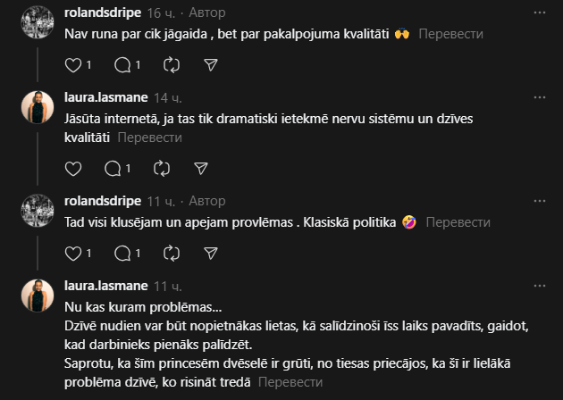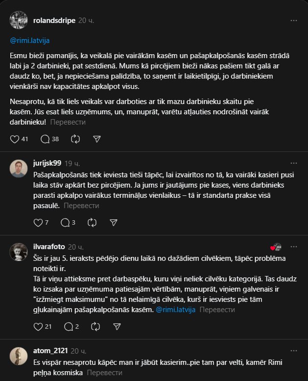 «Я часто замечаю, что у многих касс и на кассах самообслуживания работает всего 1–2 сотрудника, даже в субботу. Нам, покупателям, приходится самим решать многие вопросы, а если нужна помощь, её получить сложно — у сотрудников просто нет возможности обслужить всех. Не понимаю, как такой большой магазин может работать с таким малым количеством кассиров. Вы — крупная компания и, на мой взгляд, могли бы позволить себе нанять больше сотрудников», — пишет в соцсети Threads Роландс Дрипе.