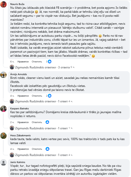 Наурис Бужа: “Ну это уже похоже на классический сценарий в FB — есть проблема, но объём поста в 3 раза больше, чем сама ситуация. Да, ненормально, что кто-то в парке с техникой выливает масло или дизель и портит покрытие — в этом нет споров. Но вопрос в том, что реально изменится после этого поста? Если ты реально видишь, что конкретная техника портит покрытие, то это решается через ответственных лиц, а не написанием романа в интернете с упоминанием «ещё одного безумия в стране». Иначе получается: виновные неизвестны, решения нет, а драма на максимум. И это сравнение с автобусной парковкой… немного преувеличено. Парк от этого не превратился в индустриальную зону, люди всё равно будут ходить и использовать его. Да, нужно привести в порядок — но это технический вопрос, а не причина создавать ощущение апокалипсиса. Реально выглядит так, что больше энергии уходит на написание возмущённых текстов, чем на простое уведомление тех, кто должен исправлять. Меньше драмы, больше конкретных действий — тогда такие вещи быстрее исчезнут, а не будут жить на Facebook неделями”