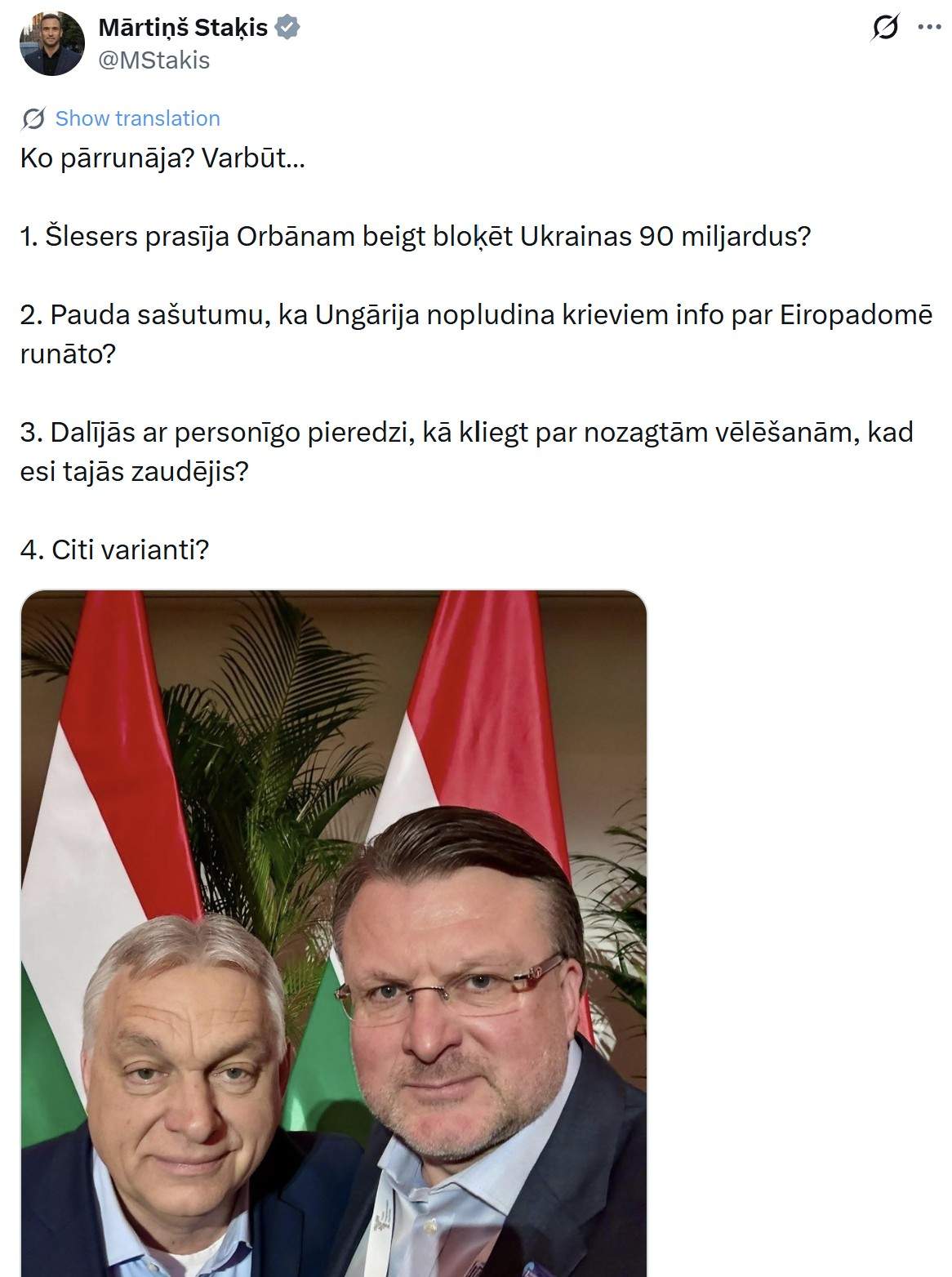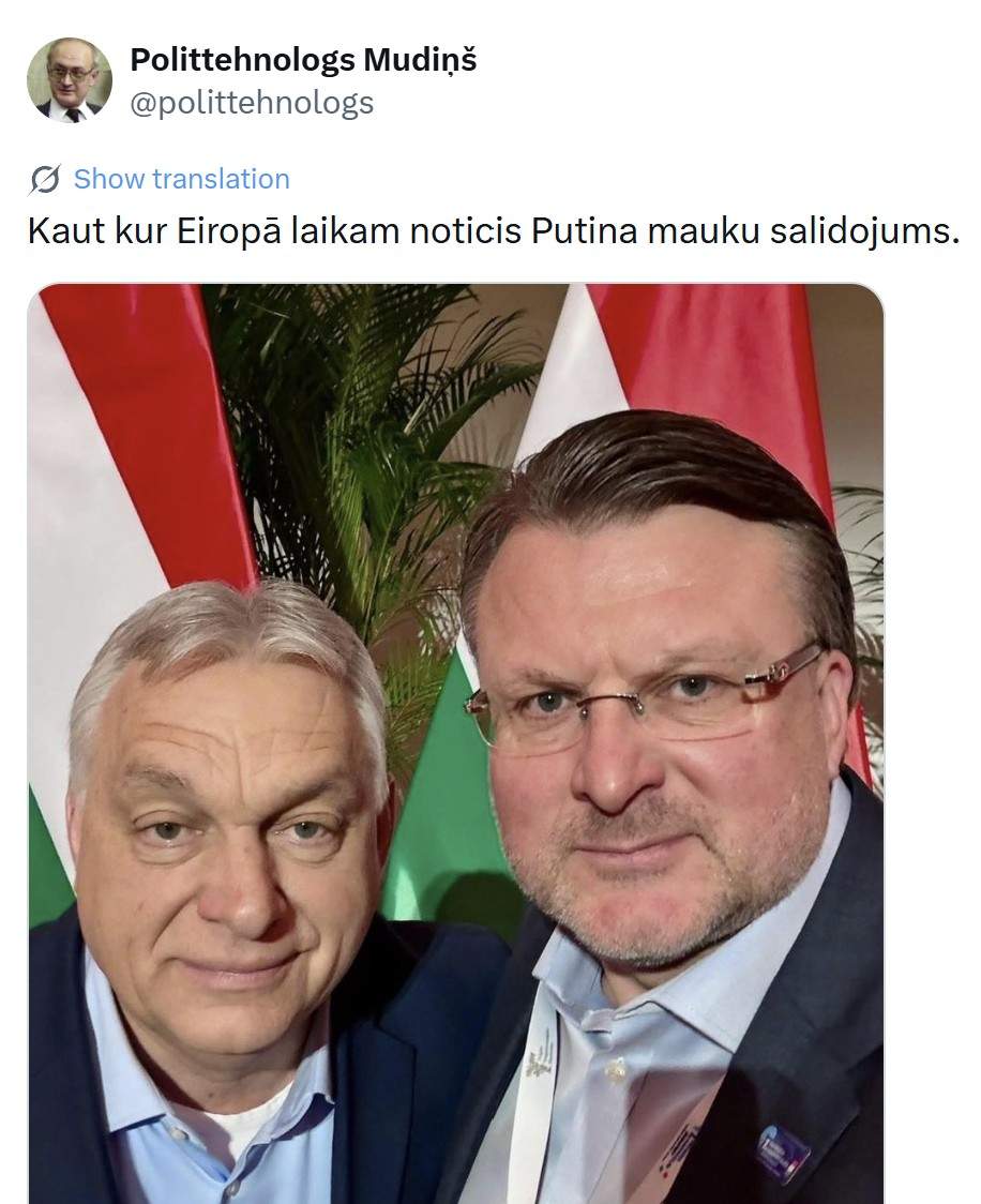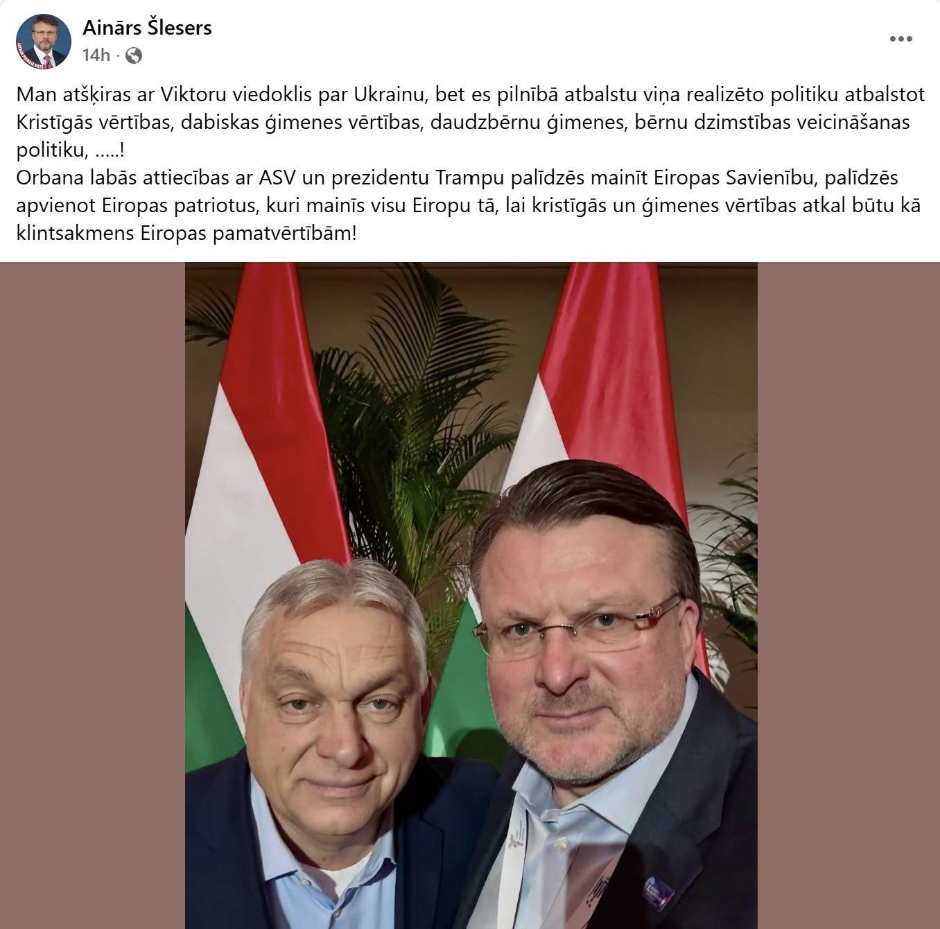 На этом фоне внимание многих привлекла реакция латвийского политика Айнарса Шлесера, который опубликовал совместное фото с премьером Венгрии Виктором Орбаном и написал: