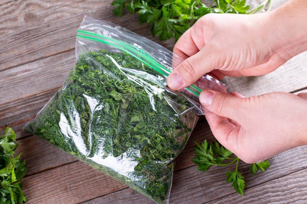 Об этом необычном способе хранения зелени знают далеко не все, но он удивительно действенный. Нужно просто положить зелень в обычный пакет для продуктов, сильно дунуть в него, чтобы он надулся, а потом скрутить верхнюю часть и плотно завязать резинкой.