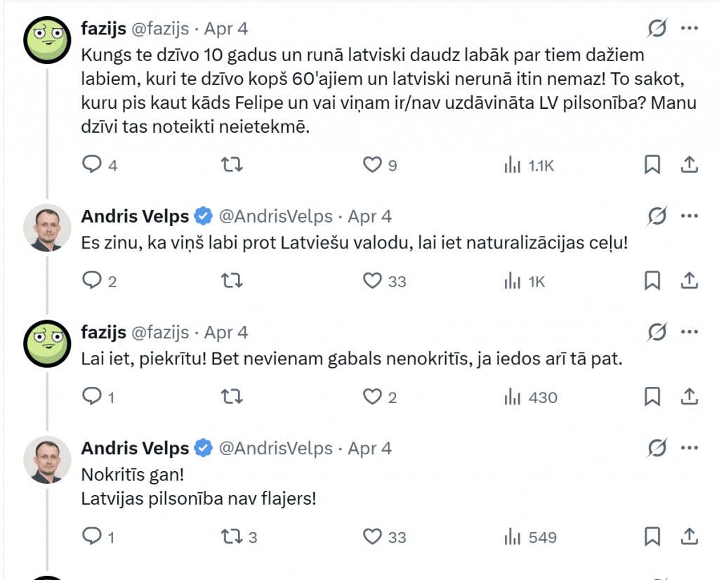 - Пользователь Velnazellis отметил: «Этот человек говорит на обоих языках — латышском и русском. Думаю, он уже доказал себя.»