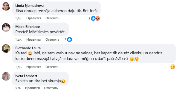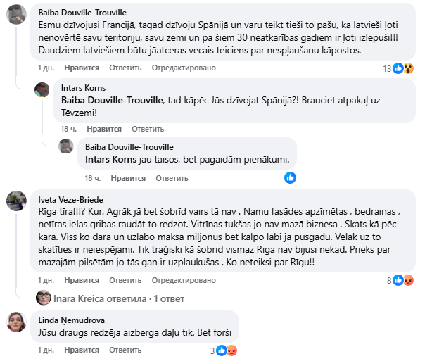Байба Дувиль-Трувиль пишет: «Я жила во Франции, сейчас живу в Испании и могу сказать то же самое: латыши очень недооценивают свою страну, и за эти 30 лет независимости стали очень избалованными! Многим латышам стоило бы вспомнить старую пословицу о том, чтобы не плевать в капусту».