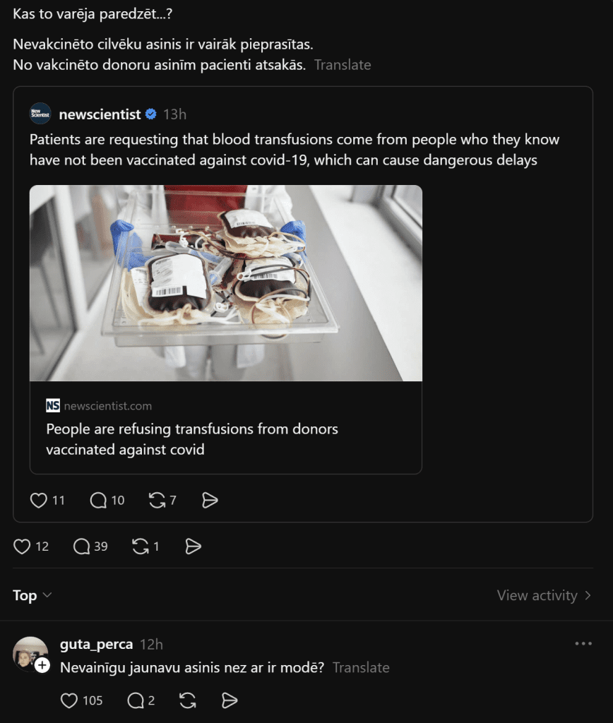 Исследование 2025 года подтвердило, что переливание крови от вакцинированных доноров безопасно. «Требования о невакцинированной крови отражают неуверенность части общества в отношении вакцин, а не реальный медицинский риск», — говорит Эш Той из Бристольского университета.