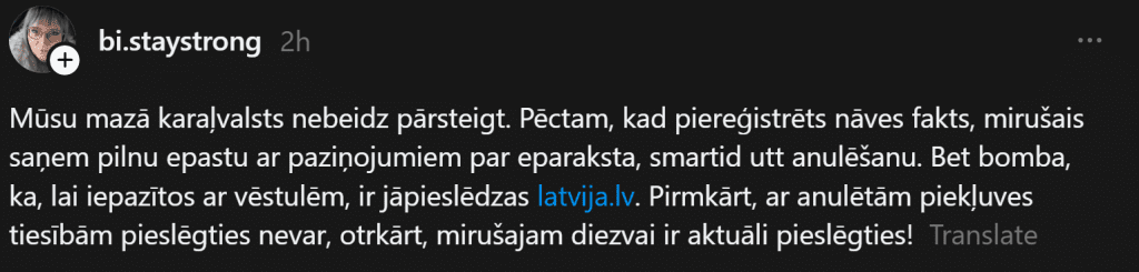 «Наше маленькое королевство не перестаёт удивлять. После того как зарегистрирован факт смерти, умерший получает полноценное электронное письмо с уведомлениями об аннулировании e-подписи, SmartID и т. д. Но бомба в том, что, чтобы ознакомиться с письмами, нужно войти на latvija.lv. Во-первых, с аннулированными правами доступа войти невозможно, во-вторых, умершему вряд ли актуально входить!» — выражает недоумение Бергила на сайте «Threads».
