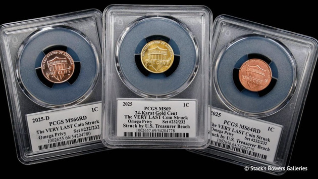 На торгах продали 232 специальных набора, каждый из которых включает три монеты: золотой цент из 24-каратного золота филадельфийской чеканки, а также последние пенни, изготовленные на монетных дворах Филадельфии и Денвера.