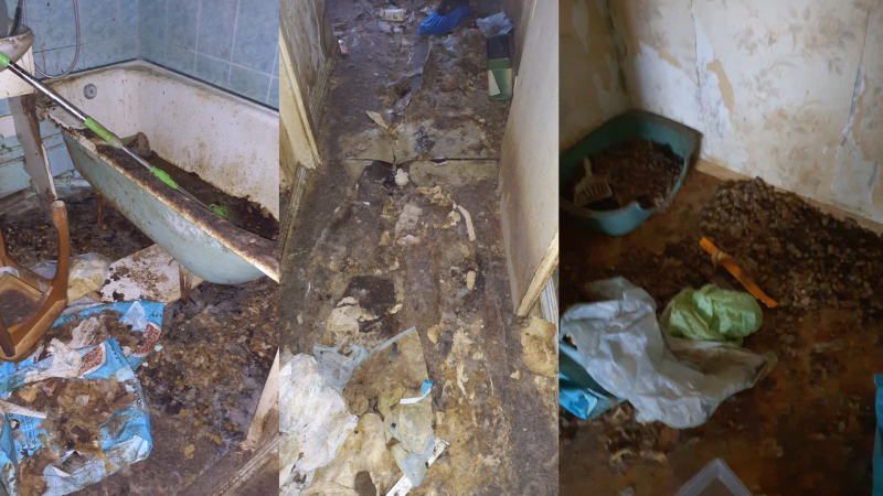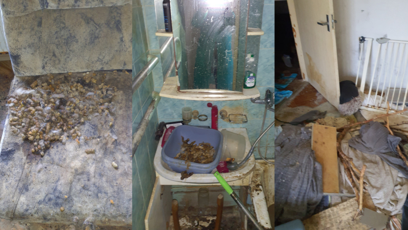 На основании решения суда инспекторы Продовольственно-ветеринарной службы и сотрудники правоохранительных органов, проникнув в квартиру, установили сильный запах мочи и экскрементов животных. Пол квартиры был покрыт экскрементами и мочой животных. В квартире были отключены электричество и вода, нигде не было ёмкостей с питьевой водой и кормом для животных. Полы всех помещений квартиры были покрыты экскрементами животных, в углах помещений слой экскрементов достигал даже десяти–пятнадцати сантиметров, что свидетельствовало о длительных нарушениях требований к благополучию животных.