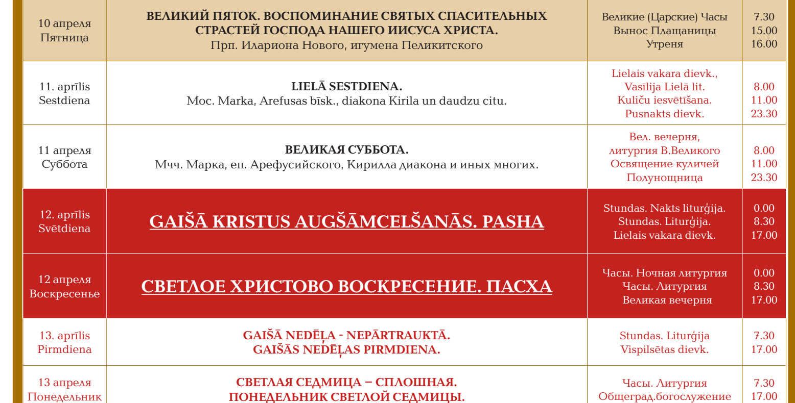 В Рига основные богослужения проходят в крупнейших православных храмах города, прежде всего в Рижский кафедральный собор Рождества Христова. Пасхальная служба начинается в ночь с субботы на воскресенье и включает крестный ход, праздничную литургию и освящение пасхальных куличей и яиц.