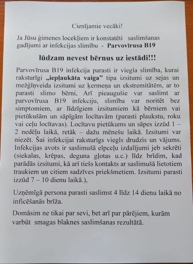 В социальных сетях родители делятся информацией о том, что в учебных заведениях очень много случаев заболевания парвовирусом В19. В Риге некоторые детские сады даже разослали предупреждения с описанием симптомов заболевания и просьбой – в случае подозрений на парвовирус В19 в семье не приводить детей в детский сад.