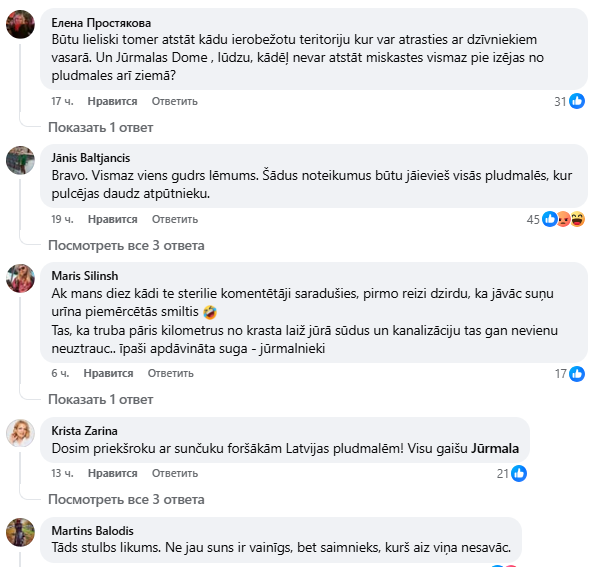 Марис Силиньш: О, мои боги, какие стерильные комментаторы собрались, впервые слышу, что надо убирать песок, пропитанный собачьей мочой. А то, что труба в нескольких километрах от берега сливает в море нечистоты и канализацию — это никого не волнует… особенно одарённая порода — юрмальцы.