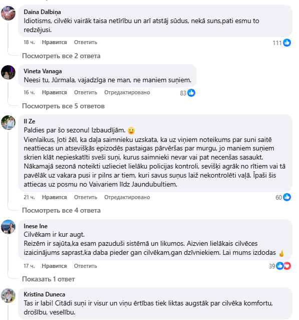 Илзе: Спасибо за этот сезон! Наслаждались. В то же время очень жаль, что некоторые хозяева считают, что правило о собаке на поводке на них не распространяется, и отдельные прогулки превращаются в кошмар: к моим собакам бегут чужие, непослушные собаки, которых хозяева либо не могут, либо даже не пытаются звать обратно. В следующем сезоне обязательно увеличьте контроль со стороны полиции, особенно рано утром или поздно вечером, когда пляж полон тех, кто выпускает своих собак неконтролируемо. Особенно это касается участка от Вайвари до Яундубулти.