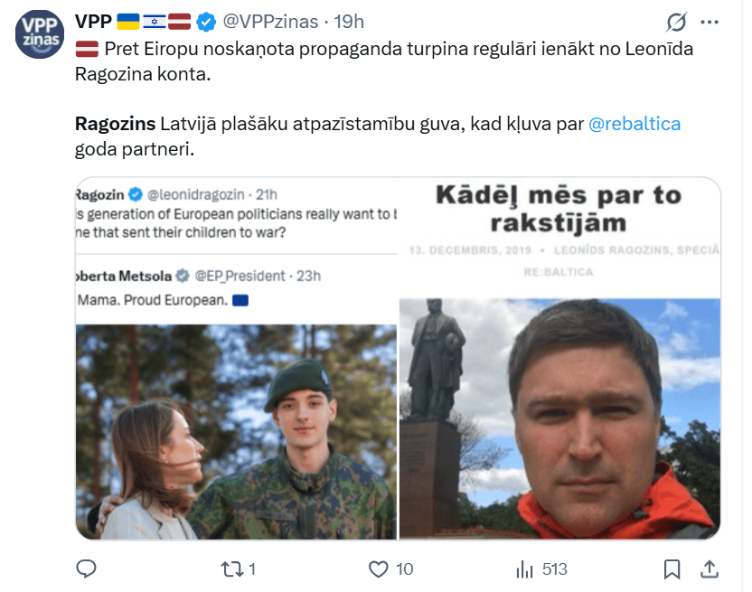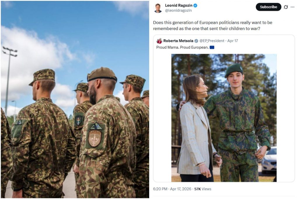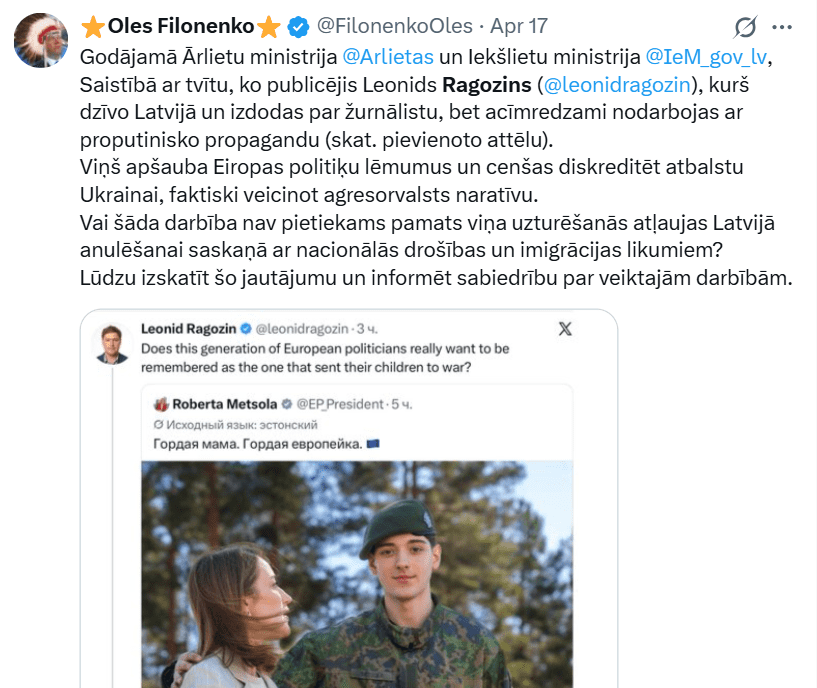 В последние дни в публичном пространстве разгорелась острая дискуссия, в которой своё отрицательное мнение высказали как иностранцы, так и латыши. Причиной стал неоднозначно оценённый пост журналиста Леонида Рагозина на платформе «X», в котором он задаёт вопрос: «Неужели политики нынешнего поколения Европы действительно хотят, чтобы их запомнили как тех, кто отправил своих детей на войну?». Он прокомментировал пост председателя Европейского парламента Роберты Метсолы, которая опубликовала фотографию с сыном в военной форме, подписав ее: “Гордая мать. Гордая мама. Гордая Европейска”.