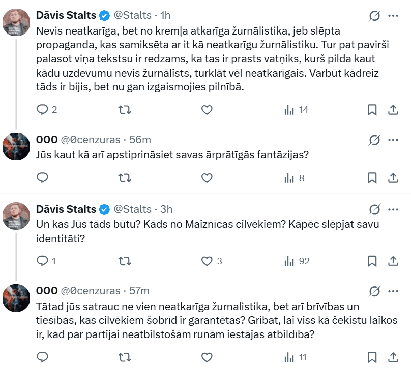 Политик Давис Сталтс, реагируя на его публикацию, резко спрашивает на платформе «X»: «Почему этот кретин всё ещё в Латвии? Почему??? Почему часть наших журналистов так за него вступалась и потом ни разу не сказала, что ошибалась? ПОЧЕМУ??? Ведь этим они (эта горстка журналистов) пятнают свою репутацию и привлекают к себе внимание как к полезному для Кремля ресурсу, который косвенно поддерживает такие гибридные инструменты Кремля, как Рогозин. Может ли кто-нибудь из медийной среды это объяснить?»