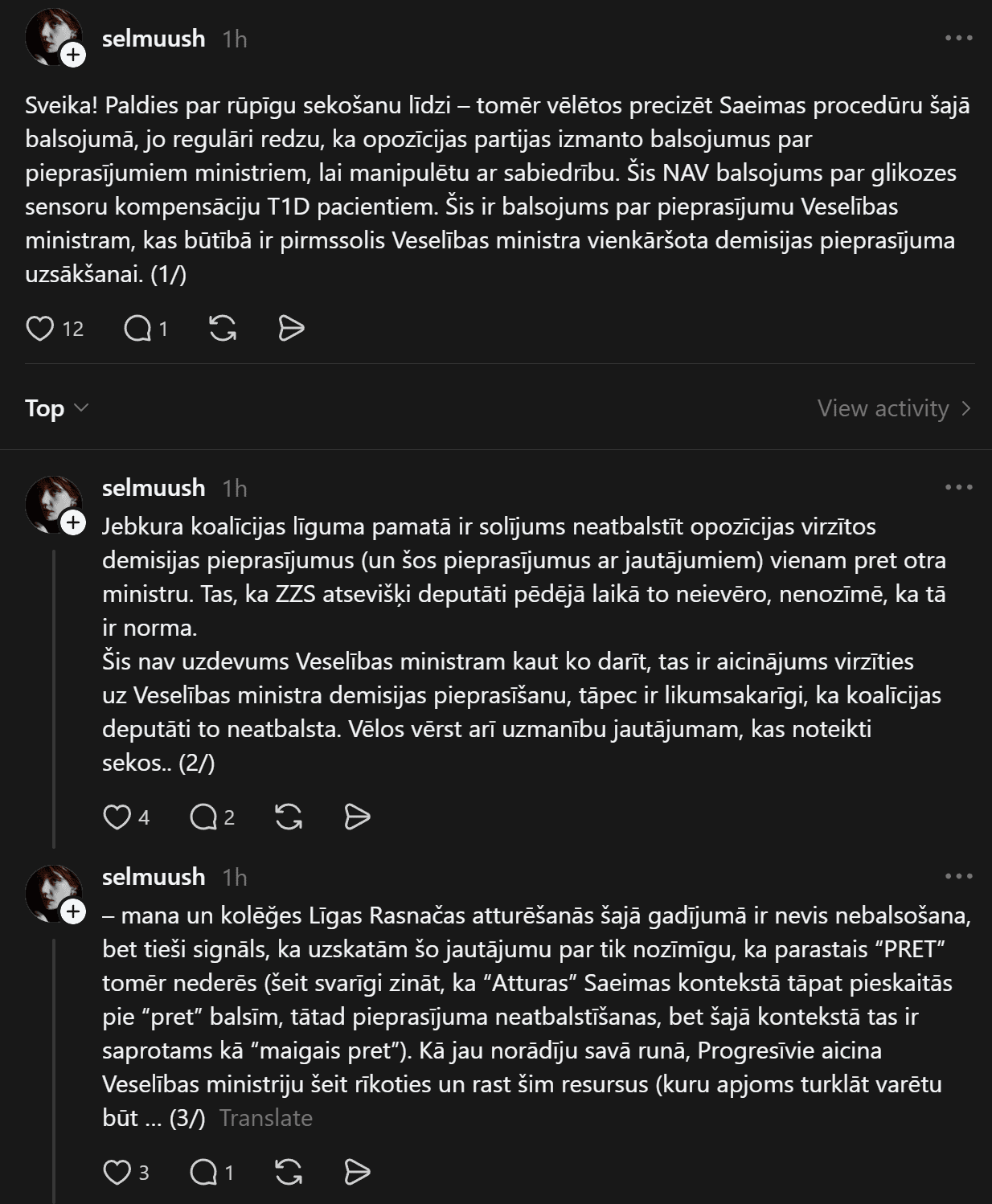 Селма Теодора Левренце из партии «Прогрессивные» поясняет, что это было голосование не о поддержке пациентов с диабетом 1-го типа, а о требовании отставки Абу Мери.