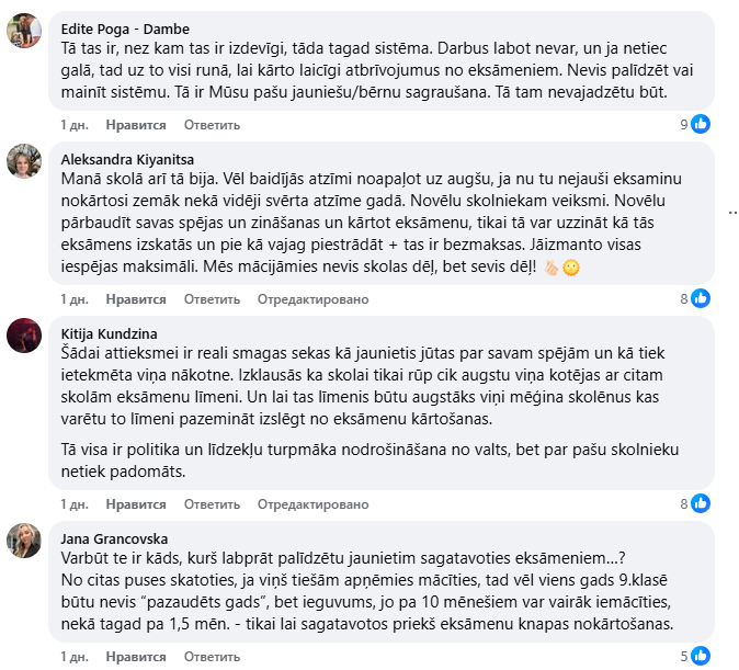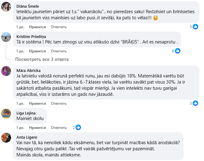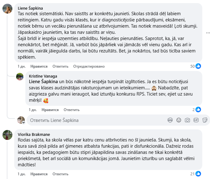 Пользователь под ником Saprast UDHS посоветовал обратиться к господину Калвансу в Министерство образования и науки, “потому что он утверждает, что в Латвии этого не происходит! Пусть он поможет вам разобраться, потому что я часто слышу об этом от родителей, а Министерство образования и науки говорит, что этого не происходит. Поэтому и алгоритма, что с этим делать, нет. Я бы рекомендовал направить обращение в образовательное управление и в другие инстанции. Иначе педагоги не понимают. Они не видят ребёнка, для многих людей он — просто статистика, к сожалению, и для педагогов часто так же… иногда руки опускаются. Тогда нужно собраться, взяться за руки и продолжать «бороться». Так же, как и вы!”