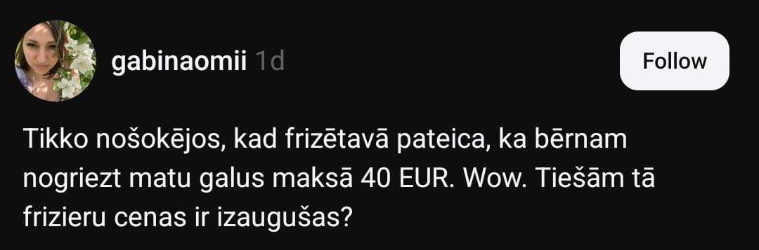 На платформе социальных сетей “Threads” Габриела пишет: «Только что была в шоке, когда в парикмахерской сказали, что подровнять ребёнку кончики волос стоит 40 евро. Вау. Неужели цены у парикмахеров так сильно выросли?»