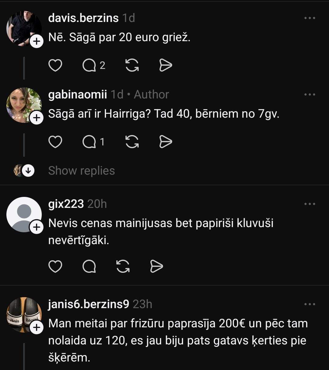 Янис также делится своим опытом: «За причёску для моей дочери у меня попросили 200 евро, потом снизили цену до 120 евро. Я уже был готов сам взяться за ножницы.»