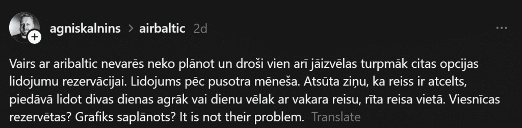 «С airBaltic больше ничего нельзя будет планировать, и, наверное, в дальнейшем тоже надо выбирать другие варианты для бронирования рейсов. Полёт через полтора месяца. Присылают сообщение, что рейс отменён, предлагают лететь на два дня раньше или на день позже вечерним рейсом вместо утреннего. Отели забронированы? График распланирован? Это не их проблема», — пишет Агнис в соцсети “Threads”. Однако часть комментаторов обращает внимание, что “airBaltic” вовсе не единственная авиакомпания, которая отменяет рейсы. Также указывается, что такое происходит и тогда, когда нет кризиса цен на топливо.