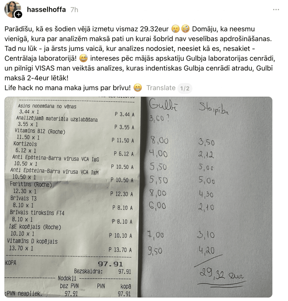 «Покажу, как я сегодня выбросила на ветер как минимум 29,32 евро. Думаю, я не единственная, кто платит за анализы сам и у кого сейчас нет медицинской страховки. Так вот, если врач спрашивает вас, где вы будете сдавать анализы, не будьте как я, не говорите: “В Центральной лаборатории!” Из интереса дома посмотрела прейскурант лаборатории Гулбиса, и абсолютно ВСЕ сделанные мной анализы, которые я нашла идентичными в прейскуранте Гулбиса, у Гулбиса стоят на 2–4 евро дешевле! Совет от моего кошелька вам бесплатно!» — делится Иева на сайте “Threads”.
