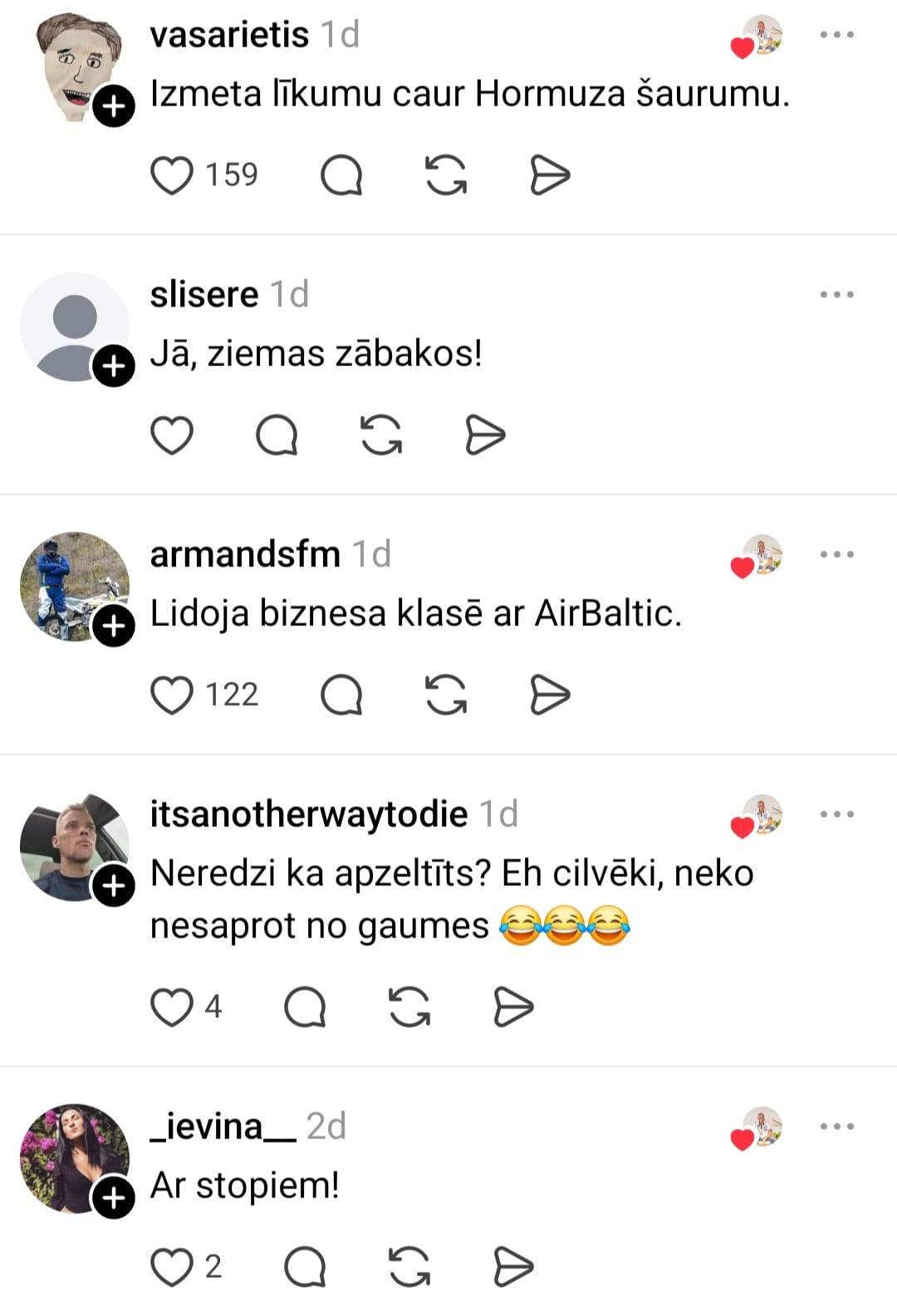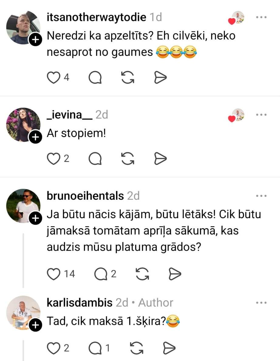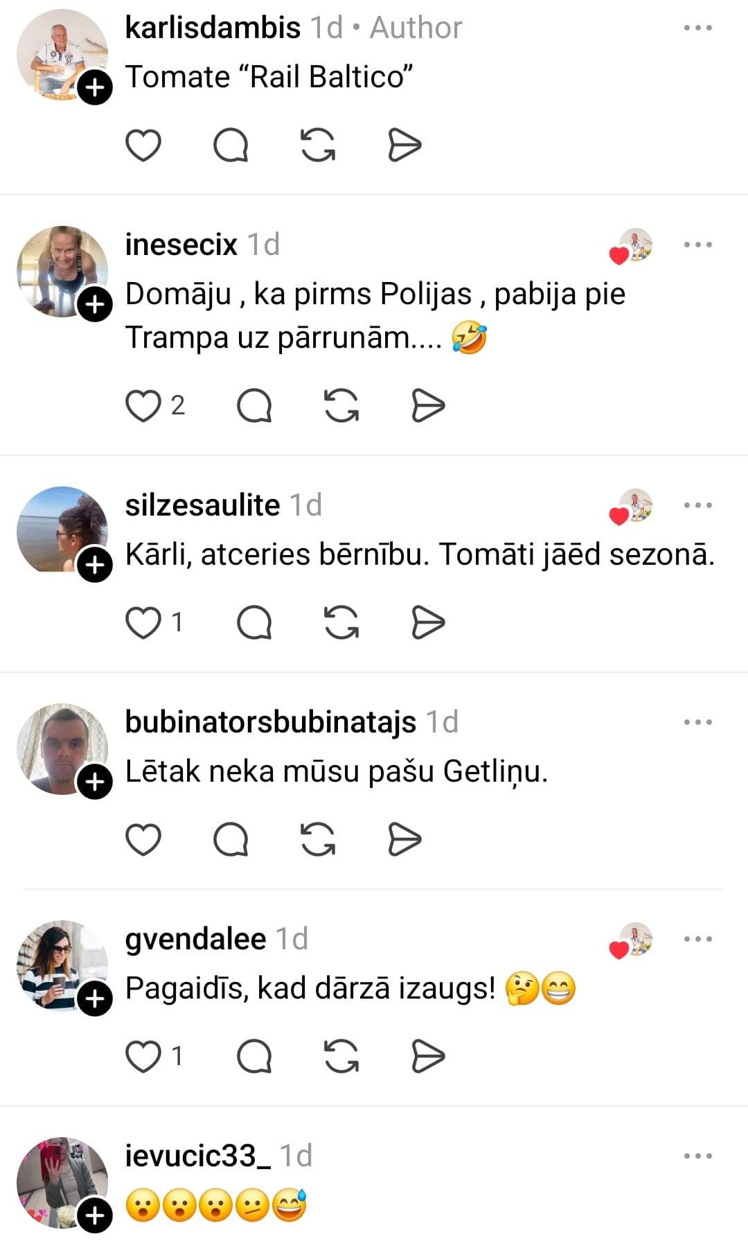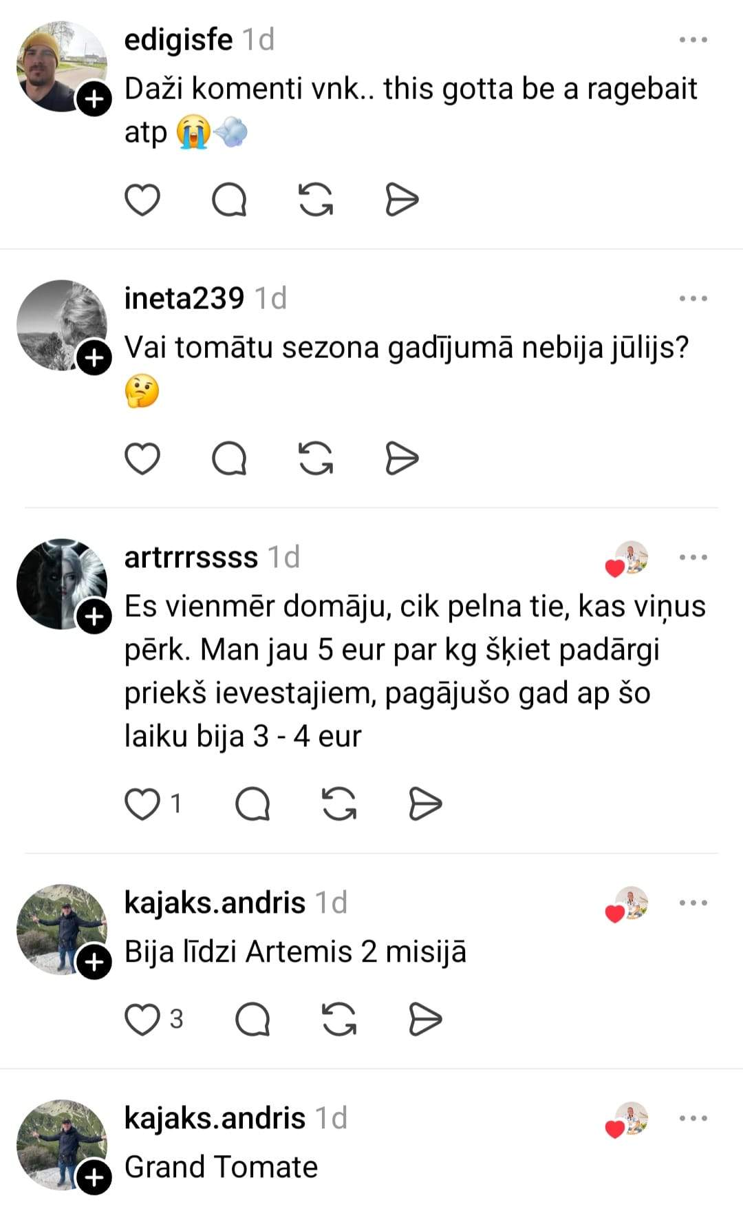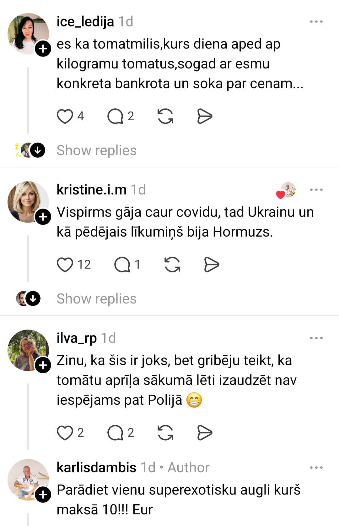 В разделе комментариев сразу развернулась оживлённая дискуссия. Одни пользователи иронизируют — «автостопом добрался» или «да, в зимних сапогах!», другие добавляют, что помидоры, наверное, «летели бизнес-классом с AirBaltic» или даже «участвовали в миссии Artemis 2». Ещё кто-то саркастически пишет, что их «выбросило на повороте через Ормузский пролив».