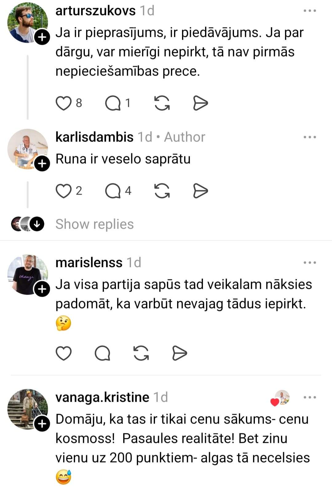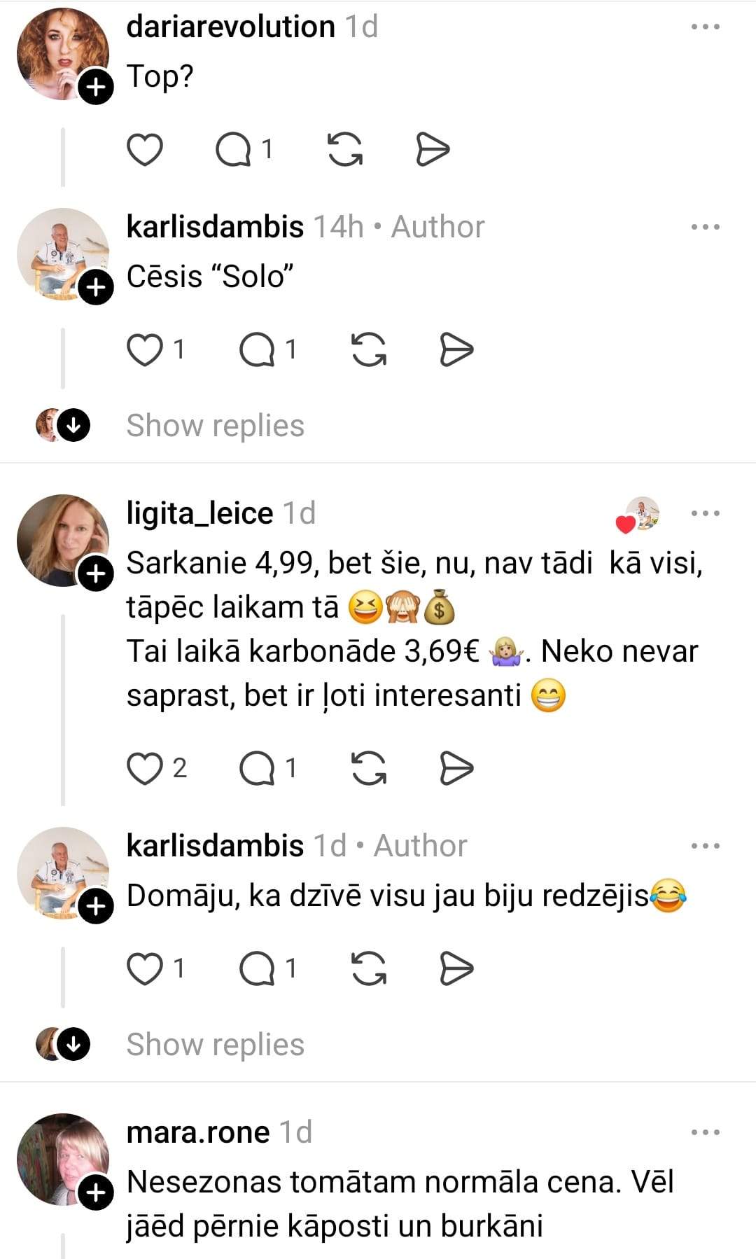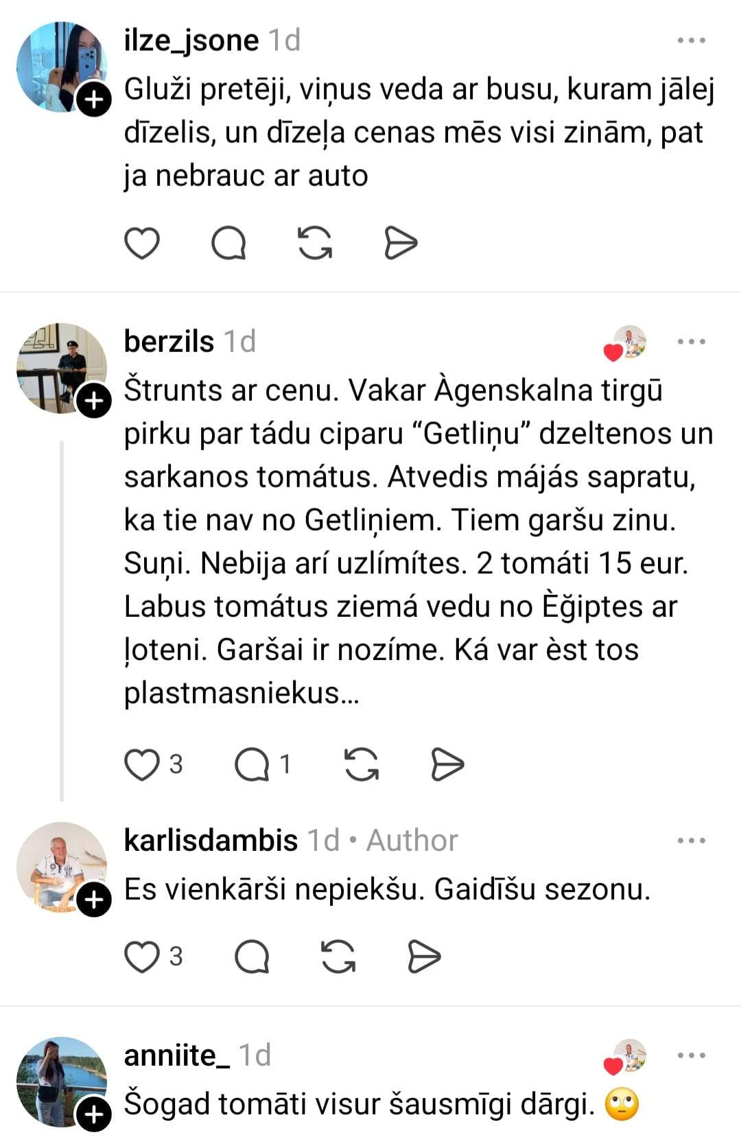 В свою очередь одна комментаторша делится опытом, что в Гетлини можно купить помидоры значительно дешевле — примерно по 3,30 €/кг, хотя очереди там, по её словам, впечатляющие. Другие добавляют, что и в других местах Латвии цены различаются — например, красные помидоры стоят около 4,99 €, что уже кажется более приемлемым.