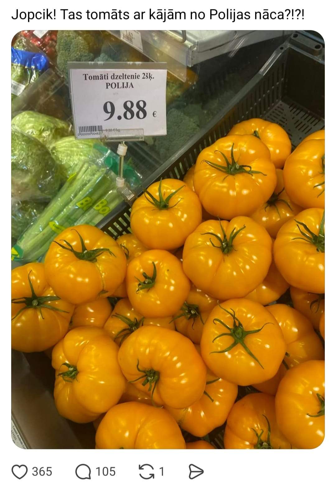 Ярким примером стала публикация одного покупателя, который в Цесисе заметил помидоры почти по 10 евро за килограмм. «Ёпсик! Этот помидор что, пешком из Польши пришёл?!?» — иронично пишет он, приложив фото ценника: «Помидоры жёлтые, 2-й сорт, Польша — 9,88 €».
