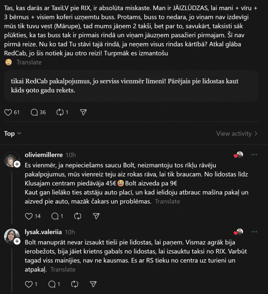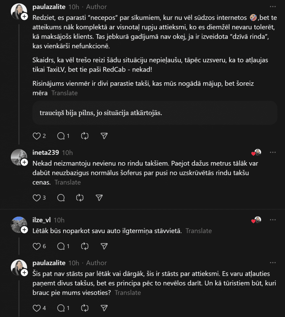 «То, что творится с “Taxi LV” у RIX, — это абсолютная помойка. Мне приходится вымаливать, чтобы меня + мужа + 3 детей + все чемоданы взял микроавтобус. Конечно, микроавтобус этого не делает, потому что ему невыгодно везти нас так близко (Марупе), тогда нам приходится брать 2 такси, но из-за этого таксисты, в свою очередь, начинают ругаться, что ведь этот микроавтобус первый в очереди и именно он должен первым брать пассажиров. Это не первый раз.