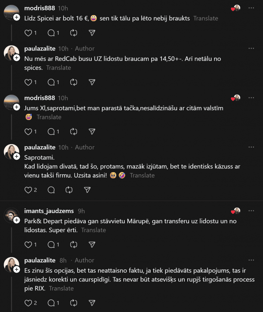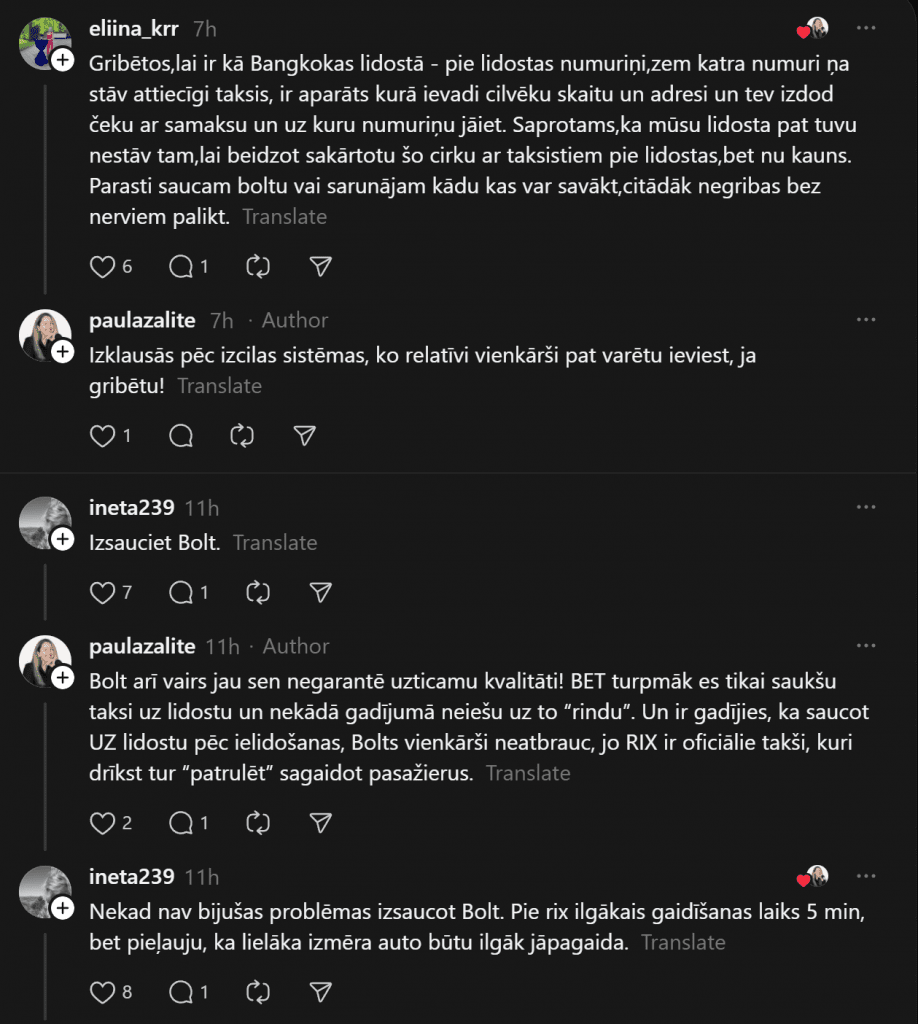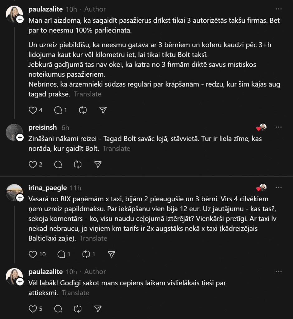 «Я всегда, если нужно, вызываю Bolt, не пользуюсь услугами этих живодёров, нас однажды чуть ли не за руку тянули, лишь бы мы поехали. От аэропорта до Тихого центра предложили 45 евро. Bolt довёз за 9 евро. Хотя чаще всего оставляю машину на стоянке, и когда прилетаю, за мной приезжает машина и отвозит к автомобилю, меньше возни и проблем», — пишет комментатор.