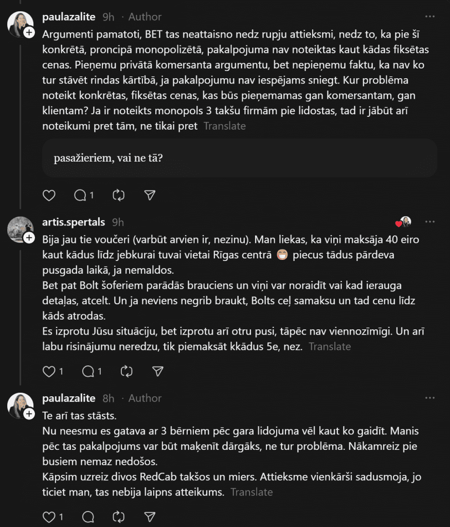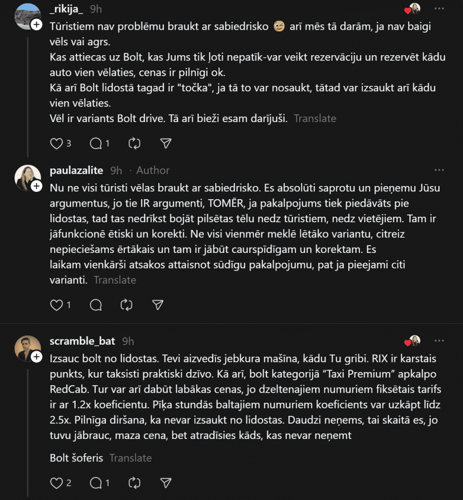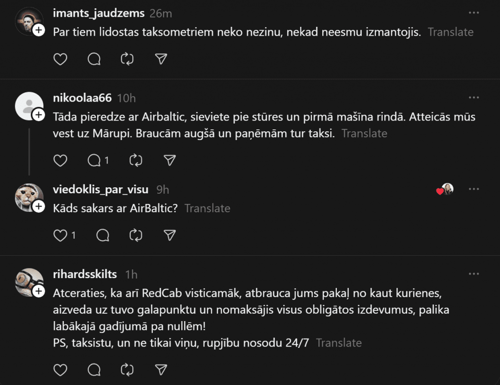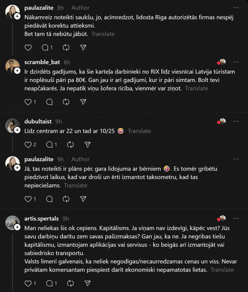 «Я всегда, если нужно, вызываю Bolt, не пользуюсь услугами этих живодёров, нас однажды чуть ли не за руку тянули, лишь бы мы поехали. От аэропорта до Тихого центра предложили 45 евро. Bolt довёз за 9 евро. Хотя чаще всего оставляю машину на стоянке, и когда прилетаю, за мной приезжает машина и отвозит к автомобилю, меньше возни и проблем», — пишет комментатор.