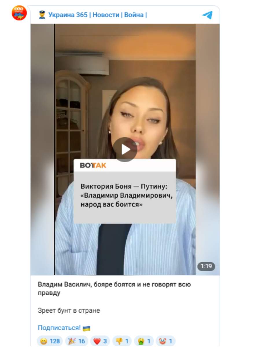 Популярная российская блогерша и бывшая участница шоу «Дом-2» Виктория Боня (с 12,9 миллиона подписчиков в Instagram), проживающая в Монако, записала видеообращение к диктатору Владимиру Путину, в котором заявила, что между властью и обществом выросла «толстая стена» и в стране нарастает опасная напряжённость. Виктория записала 18 минутное обращение к президенту РФ, в котором жёстко проехалась по губернаторам единороссам и депутатам.