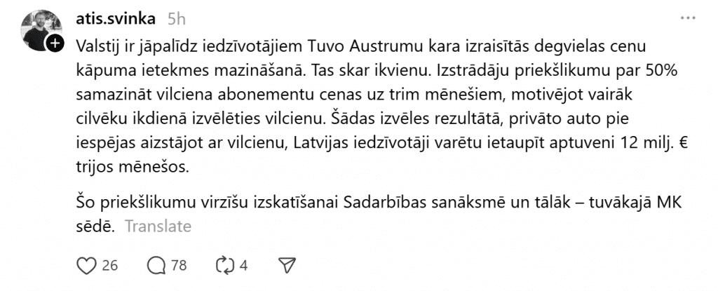 С помощью такого предложения министр надеется мотивировать больше людей выбирать поезд в качестве повседневного средства передвижения. В то же время, в результате такого выбора, по возможности заменяя личные автомобили поездом, жители Латвии могли бы сэкономить примерно 12 миллионов евро за три месяца, пишет министр.