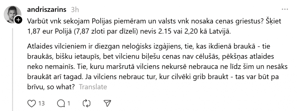 Кто-то указывает на практические проблемы — поезда ходят не во все места, куда людям необходимо добраться, поэтому для части общества скидки просто не актуальны. Ещё кто-то риторически спрашивает, почему Латвия не следует примеру других стран.