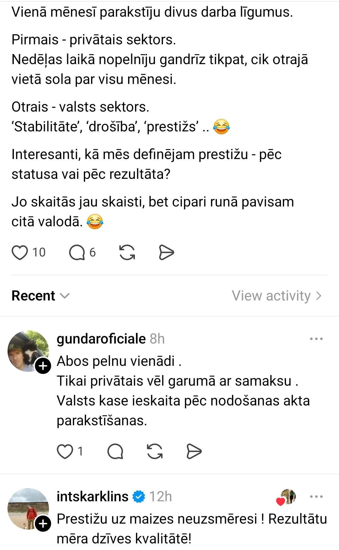 Автор публикации делится своим опытом, указывая, что в течение одного месяца подписала два трудовых договора — один в частном секторе, другой в государственном. Разница оказалась поразительной: в частном секторе за неделю она заработала почти столько же, сколько на государственной работе ей обещали за целый месяц. Между тем в государственном секторе акцент делался на «стабильности», «безопасности» и «престиже».