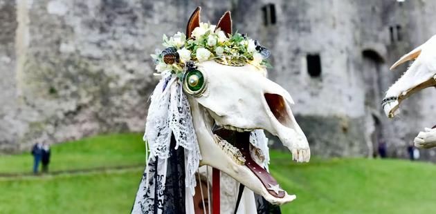 «Серая кобыла» – это фигура из конского черепа, украшенного лентами и иногда стеклянными глазами, закрепленного на длинном шесте и покрытого белым полотном. Ее носят ряженые, которые передвигают челюсти черепа, создавая ужасающий щелкающий звук.