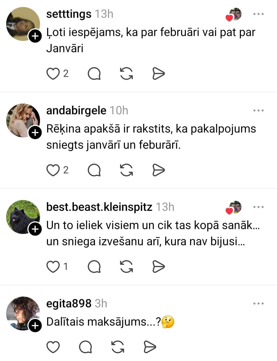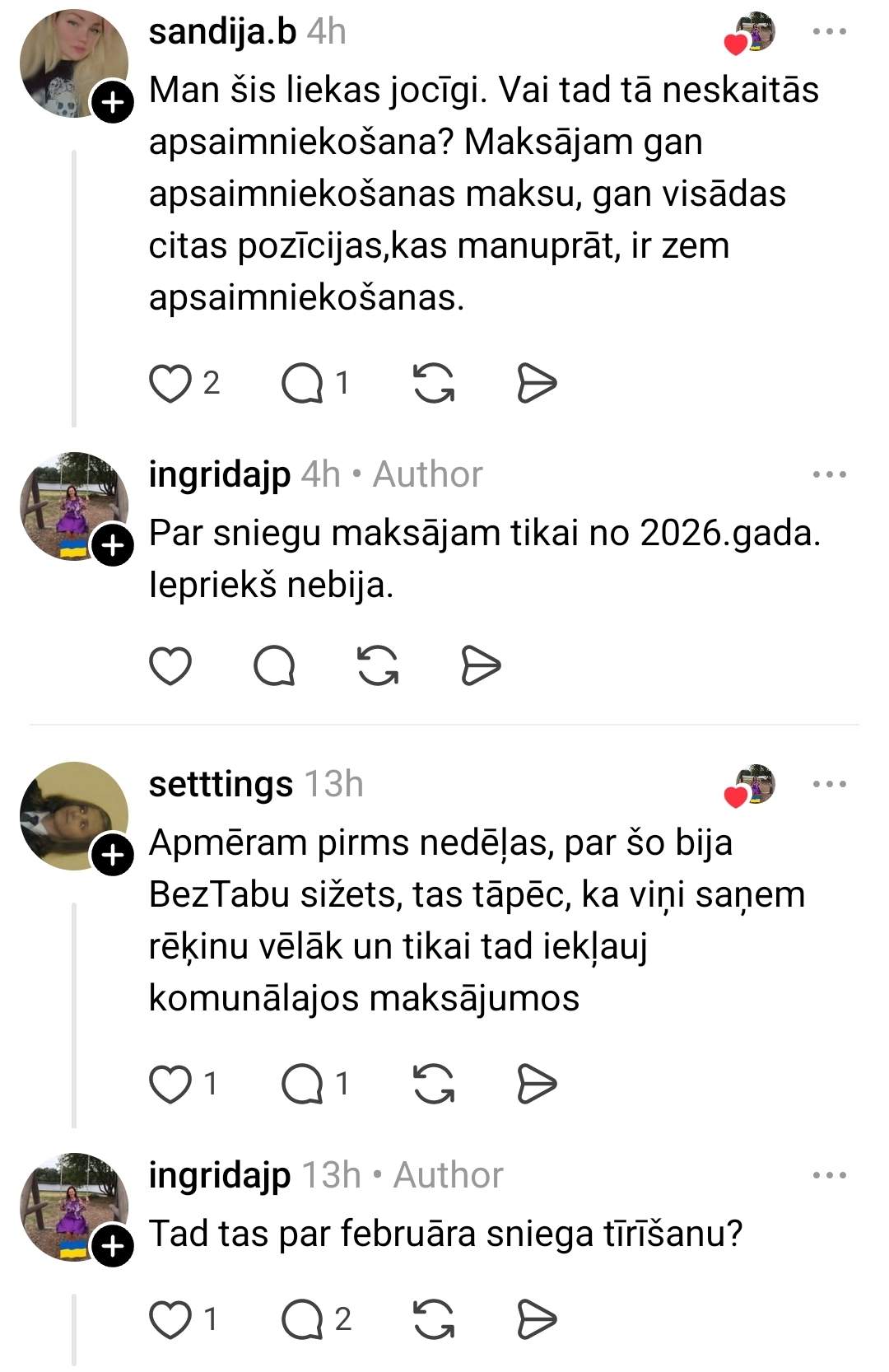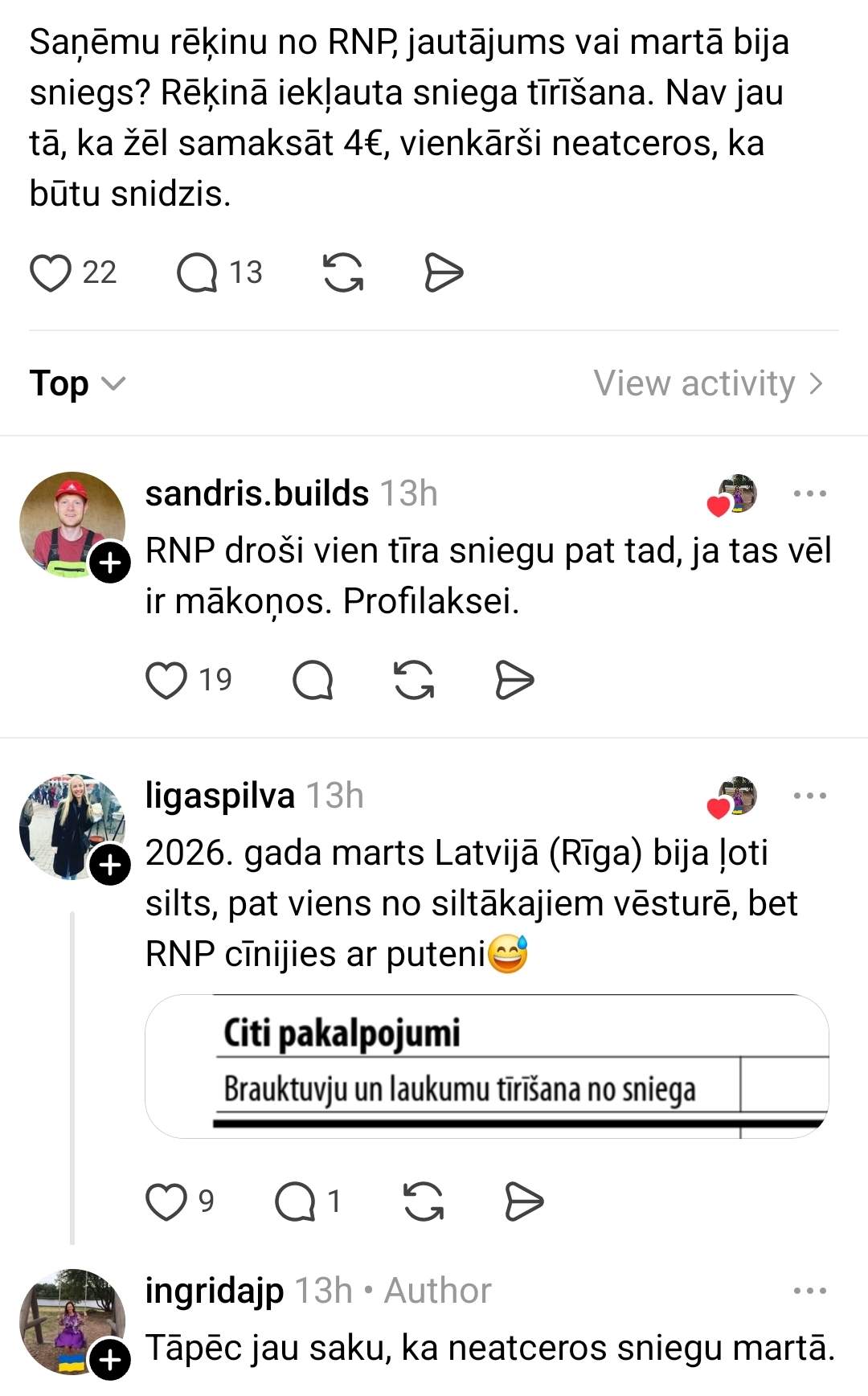 Именно такая дискуссия началась и в социальных сетях, где одна женщина поделилась своим недоумением по поводу полученного счета от «Rīgas namu pārvaldnieks». Она пишет, что в марте в счет была включена плата за уборку снега, хотя сама не помнит, чтобы в то время вообще был снег. Женщина подчеркивает — речь не о нескольких евро, а о принципе и желании понять, как формируются такие платежи.