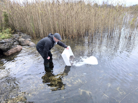 «Мы приобрели 35 кг мальков угря, каждая рыба весит около 5 граммов. Мы не только занимаемся ловлей рыбы, но и думаем о будущем, чтобы было что ловить. Основную часть финансирования предоставили рыбаки, занимающиеся промышленным рыболовством в озере Разнас. Большое спасибо им за вложенные средства!».