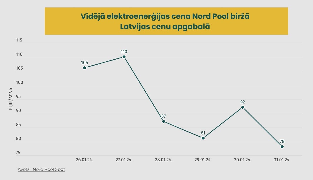 Сегодня, 31 января, средняя цена электроэнергии на бирже Nord Pool составит 78 €/МВтч или 7,8 центов/кВтч, а уже вечером она снизится до -2,02 €/МВтч или -0,2 центов/кВтч, сообщает Министерство климата и энергетики Латвии.