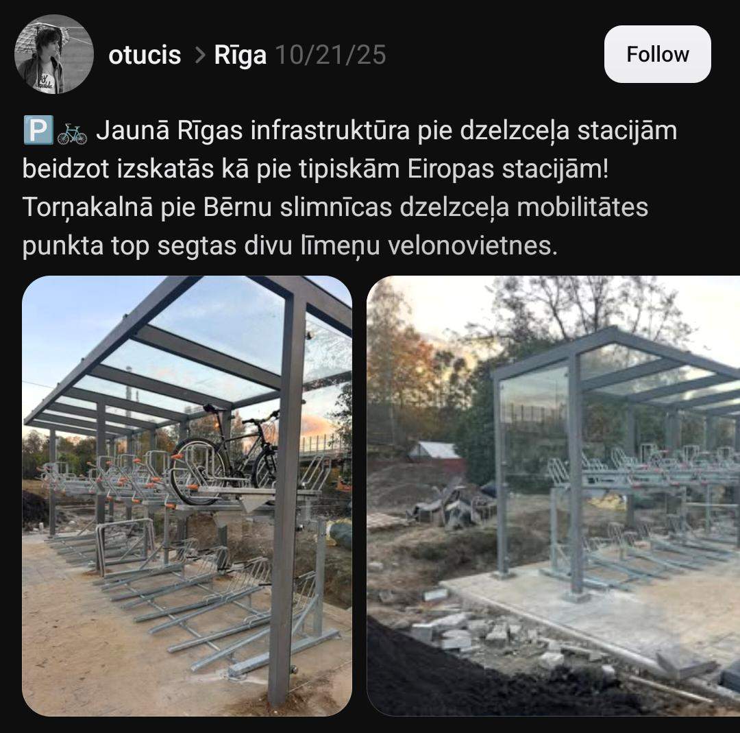 На платформе социальных сетей “Threads” Ото пишет: “Новая рижская инфраструктура у железнодорожных станций наконец-то выглядит как у типичных европейских станций! В Торнякалнсе у железнодорожного пункта мобильности возле Детской больницы создаются крытые двухуровневые велопарковки.”