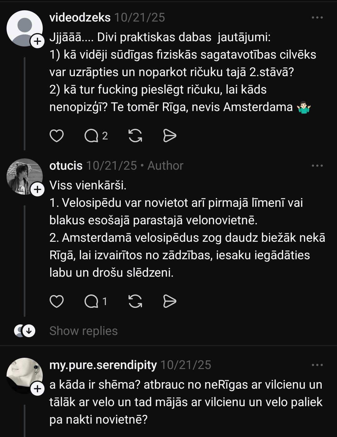 2) Как там, fu*king, пристегнуть велик, чтобы его не сп*здили? Это всё-таки Рига, а не Амстердам.”