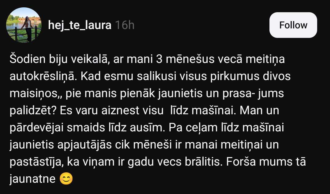 “Сегодня я была в магазине со своей трёхмесячной дочкой в автокресле. Когда я сложила все покупки в два пакета, ко мне подходит молодой человек и спрашивает: “Вам помочь? Я могу донести всё до машины.” У меня и у продавщицы улыбка до ушей”, — пишет она.