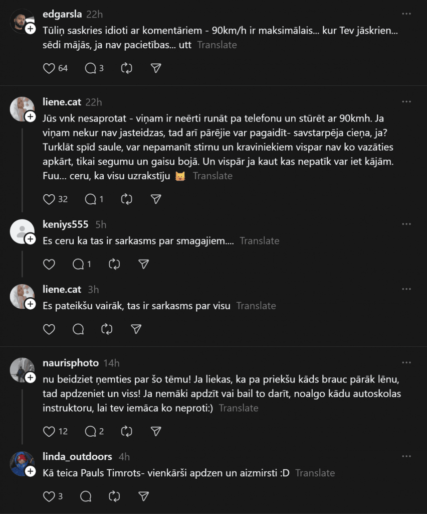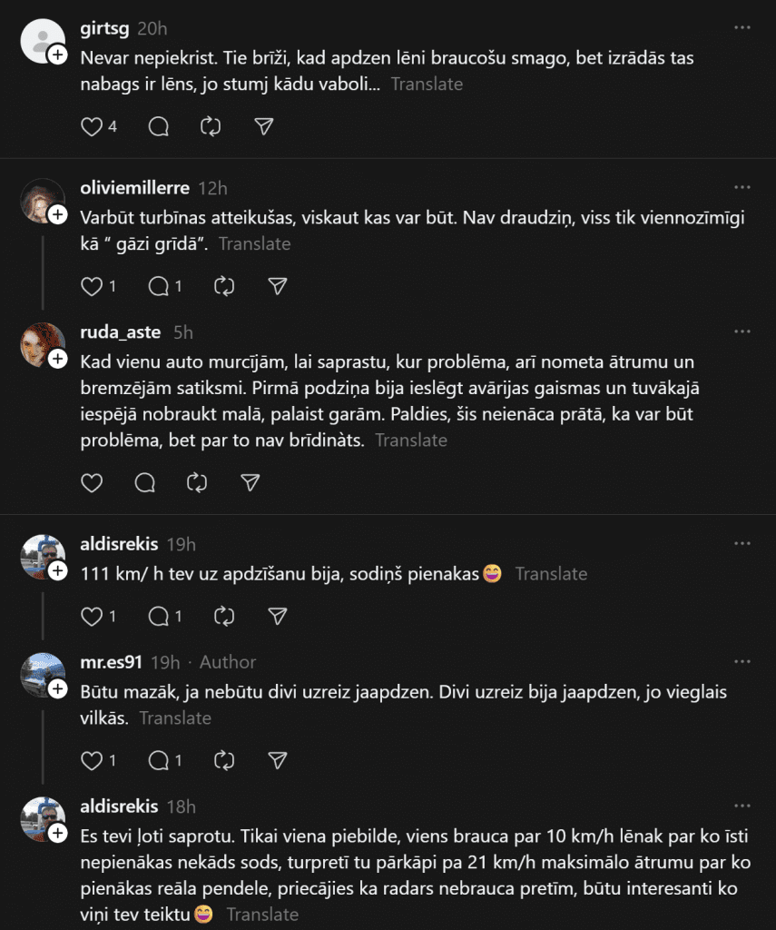 Свой комментарий по поводу увиденного дал также специалист по дорожному движению, преподаватель автошколы, доцент Эрикс Григис: «Водитель обгоняющего автомобиля приближается к более медленно движущемуся грузовому автомобилю и решает его обогнать. Уступив дорогу встречному транспорту и начав обгон, обгоняющий видит перед грузовиком легковой автомобиль, движущийся медленнее, и обгоняет также его. Какие ошибки, опасные ситуации и нарушения правил дорожного движения видны в видеосюжете?