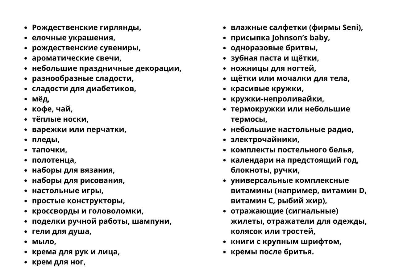 Вы можете принести нашим волонтерам вещи из списка, составленного с учетом пожеланий пансионатов и центров социального ухода. Важно: все вещи должны быть новыми. Список необходимых вещей: