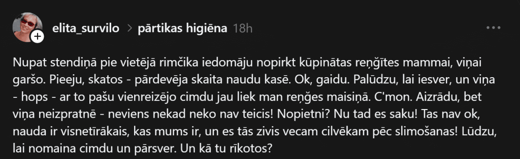 В комментариях люди обсуждают и другие случаи, когда продавщицы нарушали нормы гигиены. Например, Лига пишет: «Очень правильно… однажды в Maxima я так и оставила копчёное филе, потому что увидела, как сотрудница протирает прилавок, одновременно кашляет и чихает и теми же перчатками взвешивает и мою копчёность… оставила на прилавке, не смогла купить».