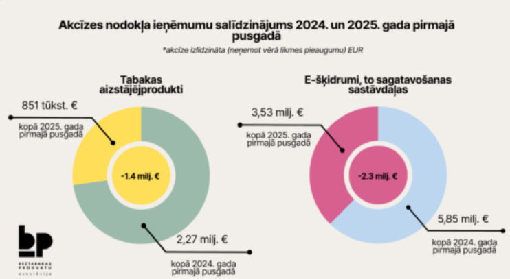 По расчётам отрасли, основанным на опубликованных данных Службы государственных доходов, в первой половине 2025 года поступления от акциза на оборот табачных заменителей по сравнению с аналогичным периодом 2024 года снизились на 62,5 %, или 1,4 миллиона евро, а доходы от акциза на e-жидкости и их компоненты — на 39,6 %, или 2,3 миллиона евро. В сумме это 3,7 миллиона евро, которых государство недополучило.