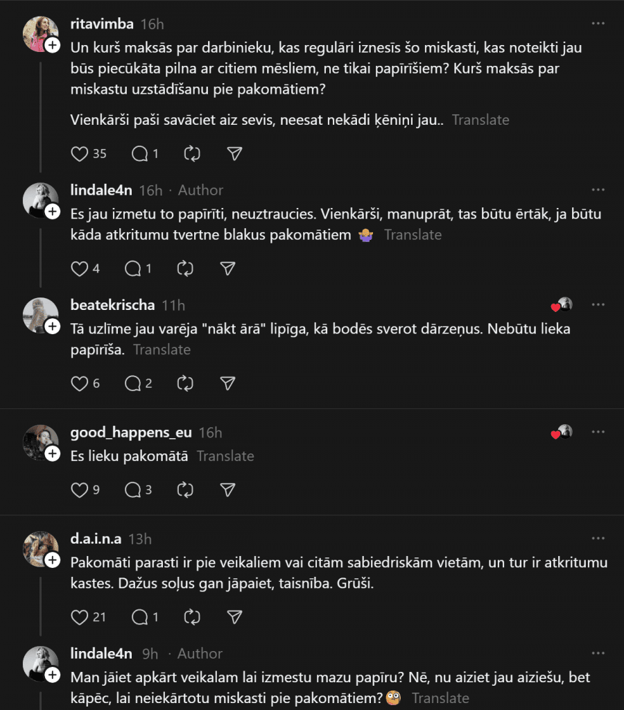 Кто-то даже приводит конкретный пример: «У Rimi на улице Валдемара в Риге есть мусорка между пакоматами Omniva и DPD — идеально!»